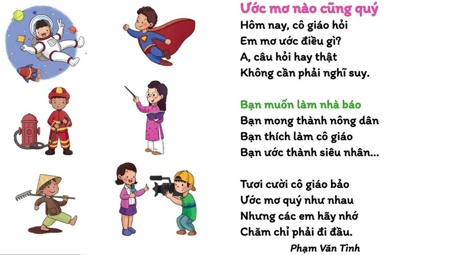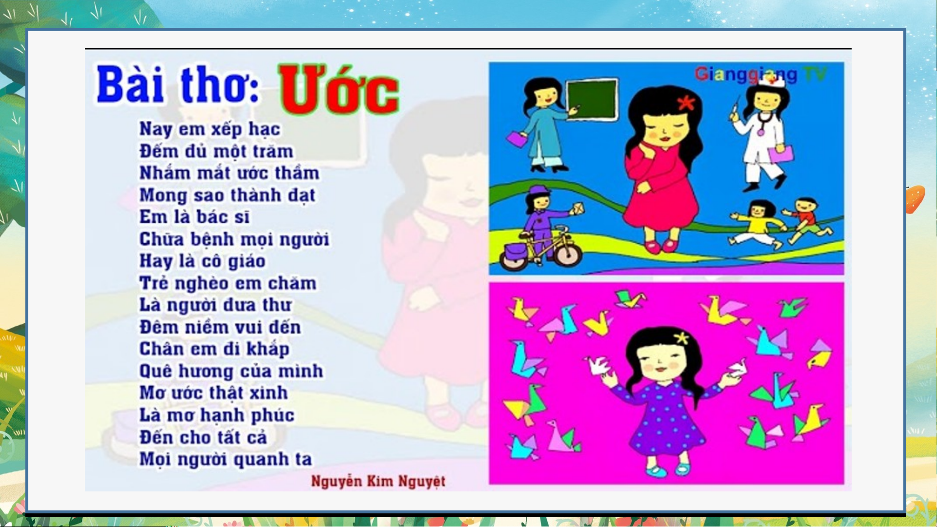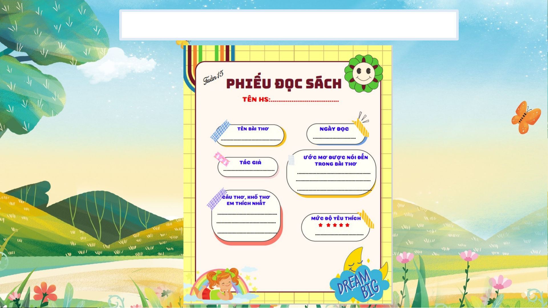 - Tìm đ c ọ bài th ơ vi t ế v ề c ướ m , ơ vi t ế đ c ượ thông tin vào phi u ế đ c ọ sách theo m u ẫ . - Biêt trao đ i ố , chia s ẻ v i ớ b n ạ v ề n i ộ dung bài th ơ đã đ c; ọ nh ớ tên bài th ơ c a ủ tác gi ả và kể lại cho ng i ườ thân. 1. Đ c ọ bài th ơ vi t ế v ề ư c ớ mơ 02. Vi t ế vào phi u ế đ c ọ sách
