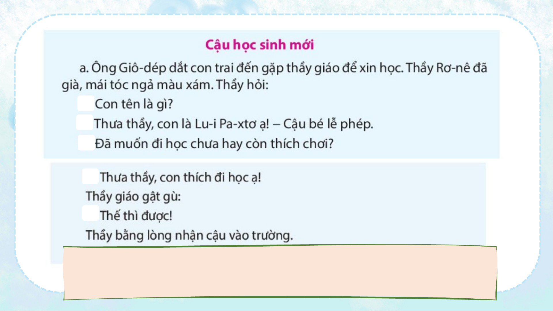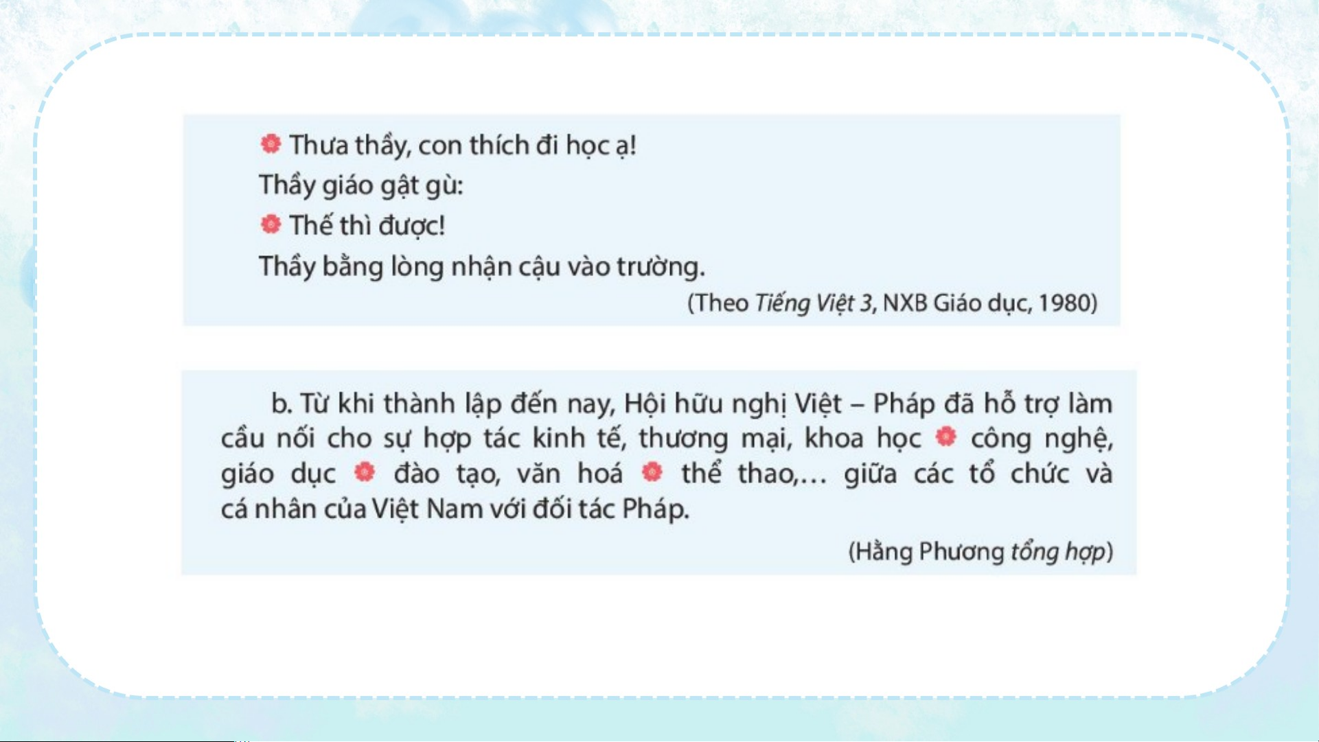 Ghi lại 1 – 2 câu h i ỏ – đáp c a ủ em và b n ạ , trong đó s ử d n ụ g d u ấ g ch ạ ngang. – Lư ng ơ Đ nh ị C a ủ là – Đ – ú Bạ ng n đ c ấ ó y b! i t ế Nhnàh à bá bác c h c ọ nhà bác h c ọ c a ủ Lươ h ng c ọ L Đư ị ng ơ nh Đ Củnh ịa Cđã a ủ có nước Vi t ệ Nam. nhữ n ở ng ư đó c ớ nà ng o gó k p htô o ng ? l n ớ cho nền nông nghi p ệ Vi t ệ Nam... Nêu tác d n ụ g c a ủ d u ấ g ch ạ ngang trong đo n ạ sau: Tin-tin: – C u ậ đang làm gì v i đ ớ ôi cánh xanh y? ấ Em bé th ứ nh t: