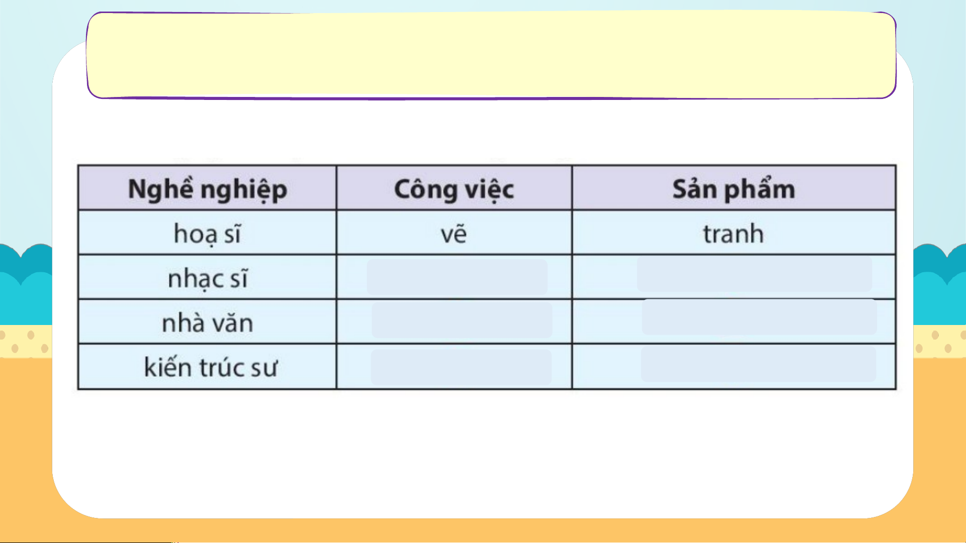2. Tìm từ ngữ phù hợp với các cột trong bảng. sáng tác nhạc bài hát, bản nhạc viết truyện, kí,.. thiết kế bản vẽ kĩ thuật GV ĐIỀN VÀO ĐÂY GV ĐIỀN VÀO ĐÂY GV ĐIỀN VÀO ĐÂY GV ĐIỀN VÀO ĐÂY GV ĐIỀN VÀO ĐÂY