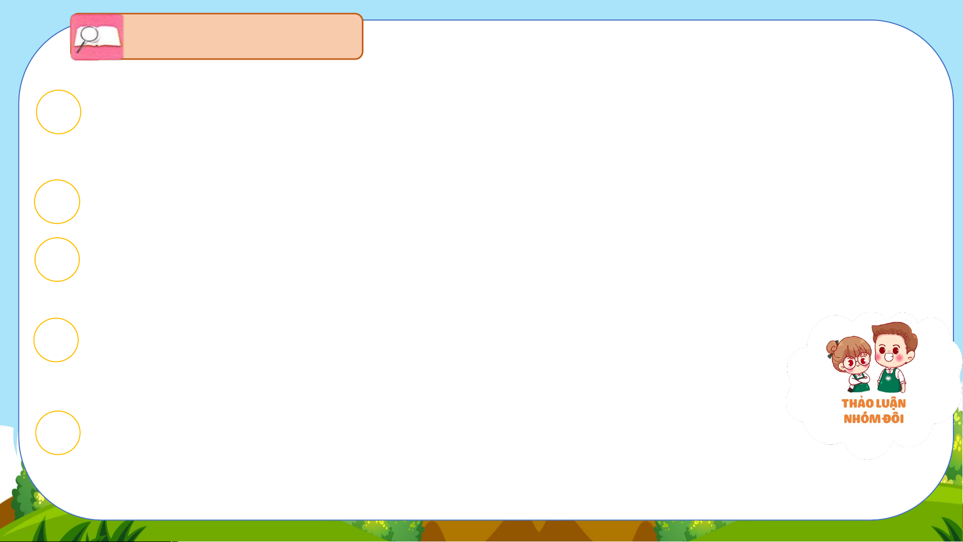nghiệm và khám phá sẽ đem lại niềm vui cho mỗi người. 4 Nhóm đôi Nếu có thời gian rảnh Vẽ Sáng tác thơ rỗi, em sẽ làm gì? Vì sao em thích làm việc đó? Làm đồ chơi Tai nghe Mắt dõi Tay dò ĐỒNG CỎ NỞ HOA