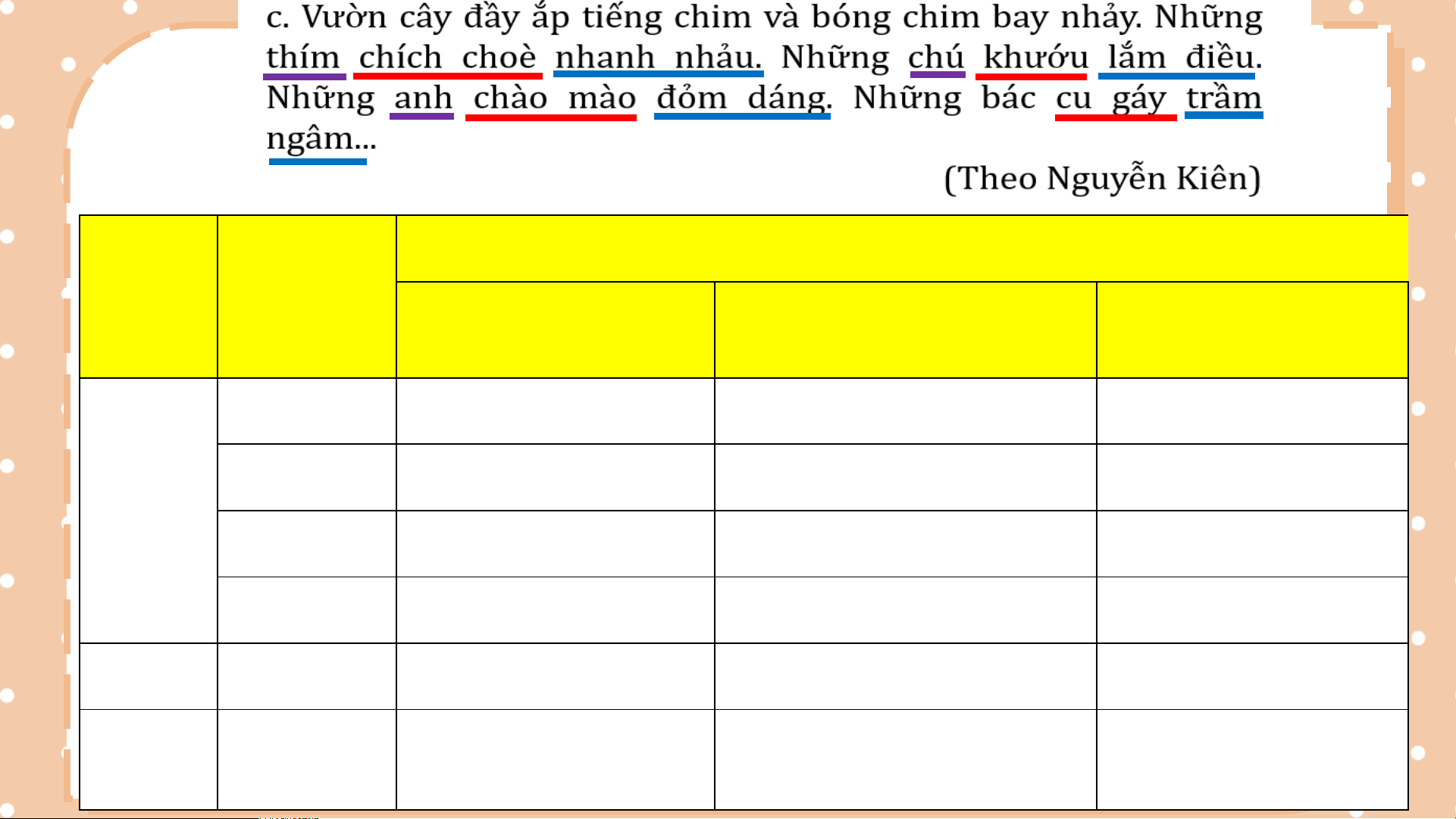 ế g chim và bóng chim bay nh y ả . Nh n ữ g thím chích choè nhanh nh u ả . Nh n ữ g chú khư u ớ l m ắ đi u ề . Nh n ữ g anh chào mào đ m ỏ dáng. Nh n ữ g bác cu gáy tr m ầ ngâm.. (Theo Nguy n ễ Kiên) Hoàn thành phi u ế bài t p ậ Đoạn Vật, hi n ệ Cách nhân hóa tượng đư c ợ Gọi vật, hi n ệ Dùng t ừ ng ữ ch ỉ ho t ạ Trò chuy n ệ , x n ư g nhân hóa tượng tự nhiên động, đ c ặ đi m ể c a ủ hô v i ớ v t ậ , hi n ệ b n ằ g nh n ữ g từ ngư i ờ để k , ể t ả v ề tượng t ự nhiên ngữ chỉ người. vật, hi n ệ tượng t ự như v i ớ ngư i ờ . nhiên. a v b c Đo n ạ V t ậ , hi n ệ Cách nhân hóa tượng được nhân hóa G i ọ v t ậ , hi n ệ tư n ợ g t ự Dùng t ừ ng ữ ch ỉ ho t ạ đ n ộ g, đ c ặ Trò chuy n ệ , x n ư g hô v i ớ nhiên b n ằ g những từ ng ữ đi m ể c a ủ người đ ể k , ể t ả v ề v t ậ , hi n ệ tư n ợ g tự nhiên ch ỉ ngư i ờ . v t ậ , hi n
