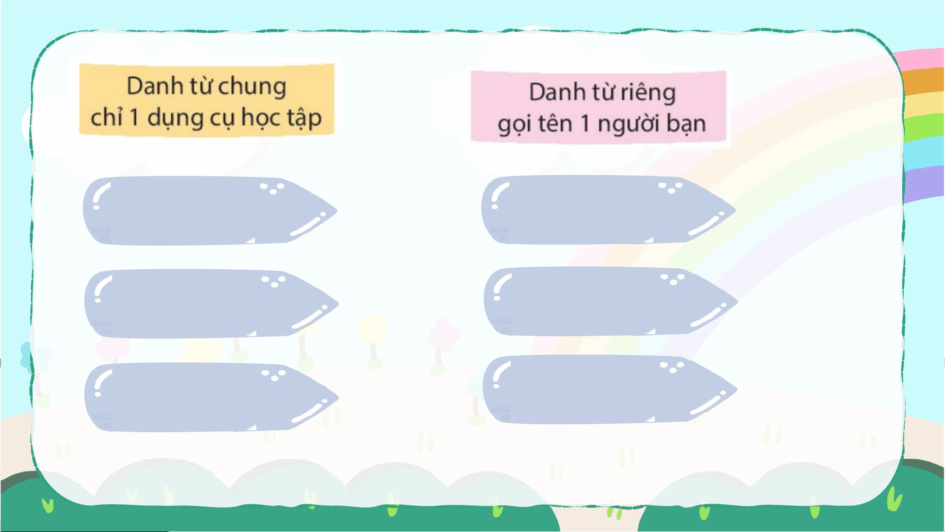 4. Tìm danh từ theo gợi ý dưới đây: Tìm danh từ theo mỗi nhóm và viết ra giấy nháp bút Trang sách Hoa vở Nam giáo viên Hoàng Diệu ca sĩ Xuân Thủy bác sĩ Phạm Hùng bát Thái Lan nồi Hàn Quốc chảo Pháp