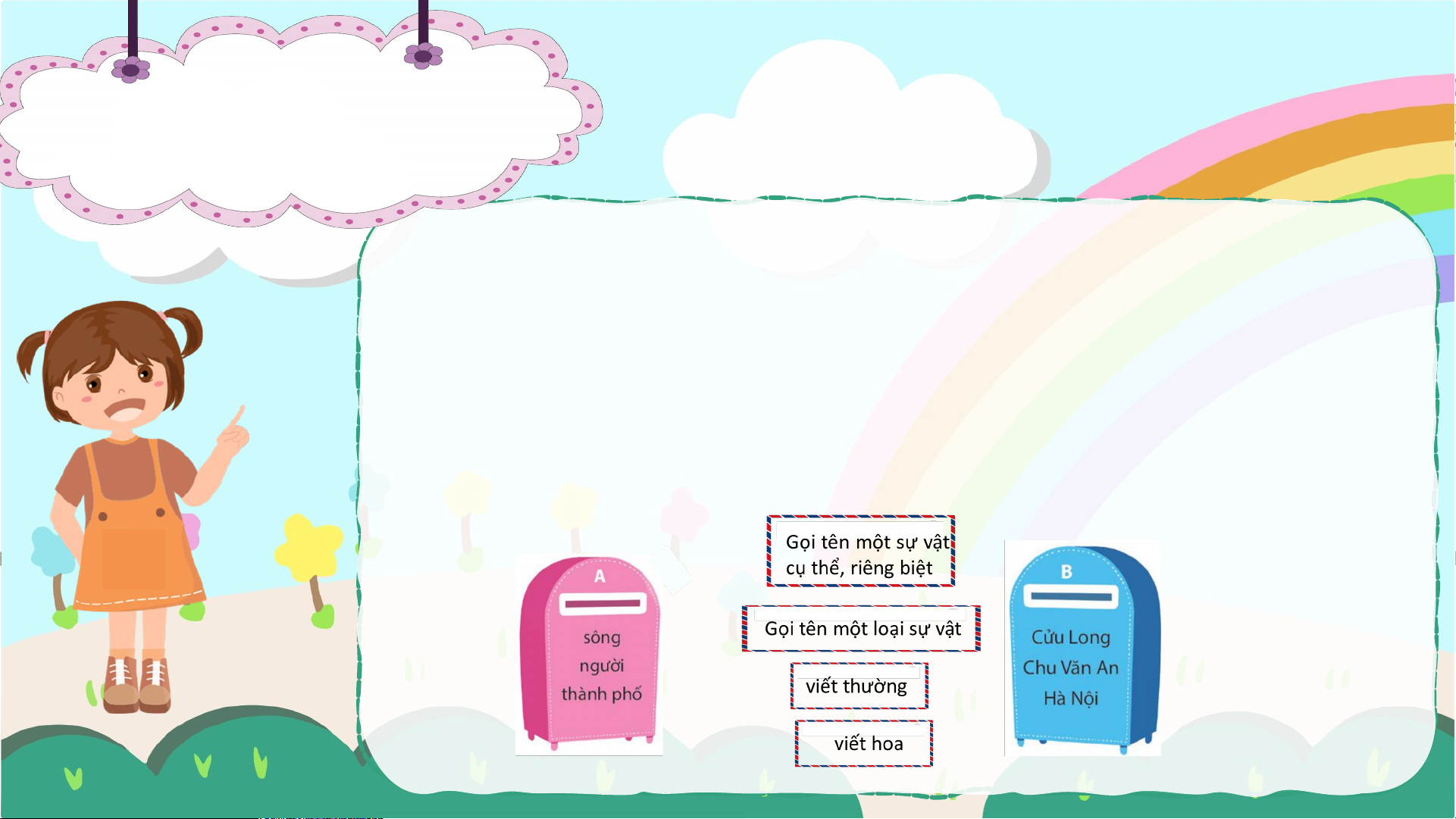 G: Mỗi phong thư ghi nội dung hoặc cách viết của một nhóm từ trên hộp thư A hoặc B. Gọi tên một sự vật cụ thể, riêng biệt Gọi tên một loại sự vật viết thường viết hoa Luật chơi