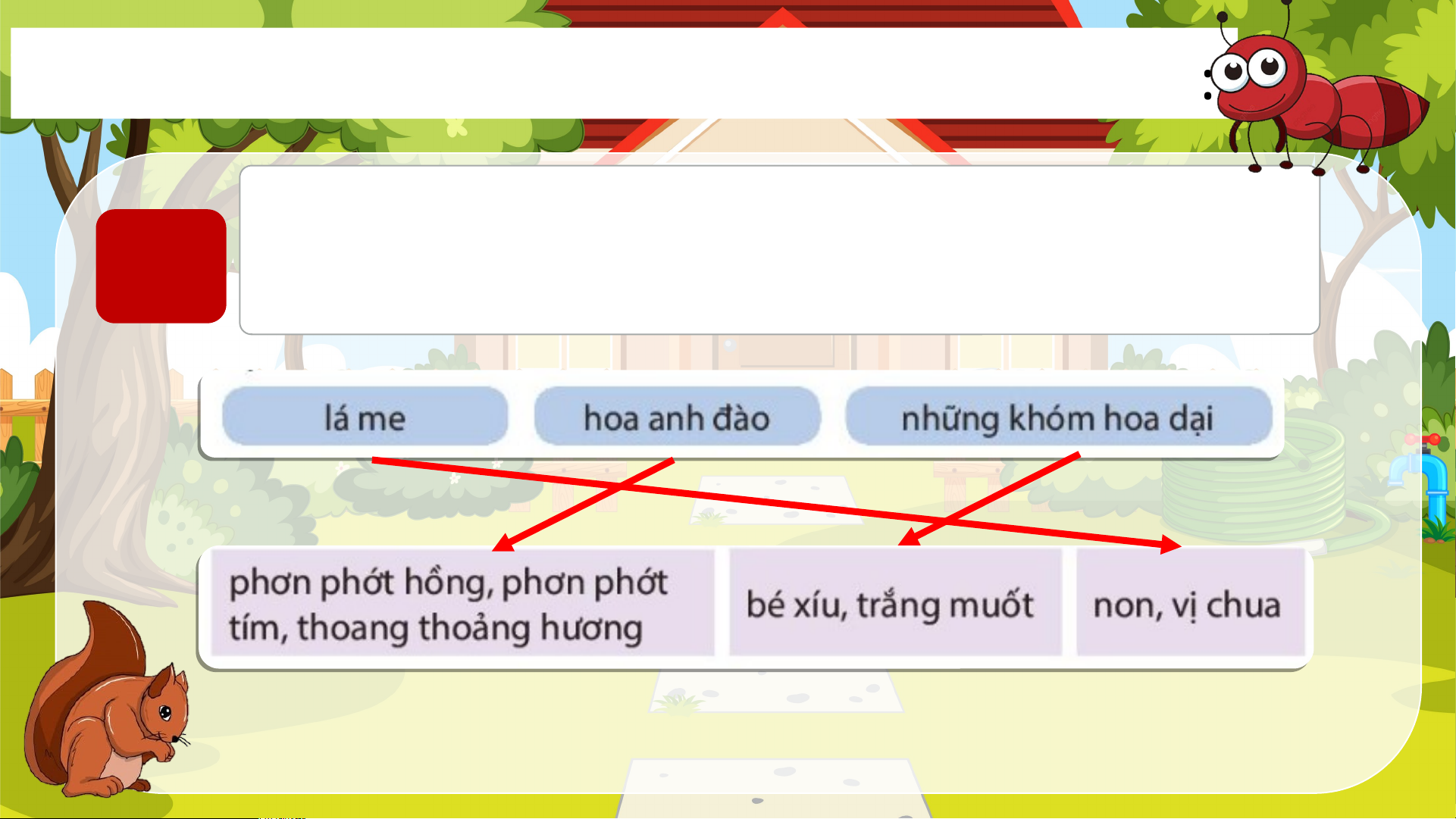 Em sẽ trồng cây me. G c ố me mát rư i. ợ M ẹ quét s c ạ h bong đ t ấ cát, đ ể m i ỗ x ế tr a ư ng ủ d y ậ , hai ch ịem d n ẫ nhau ra ng i ồ ch i. ơ Lá me non m ẹ n u ấ canh cá n c ụ , vị chua th m