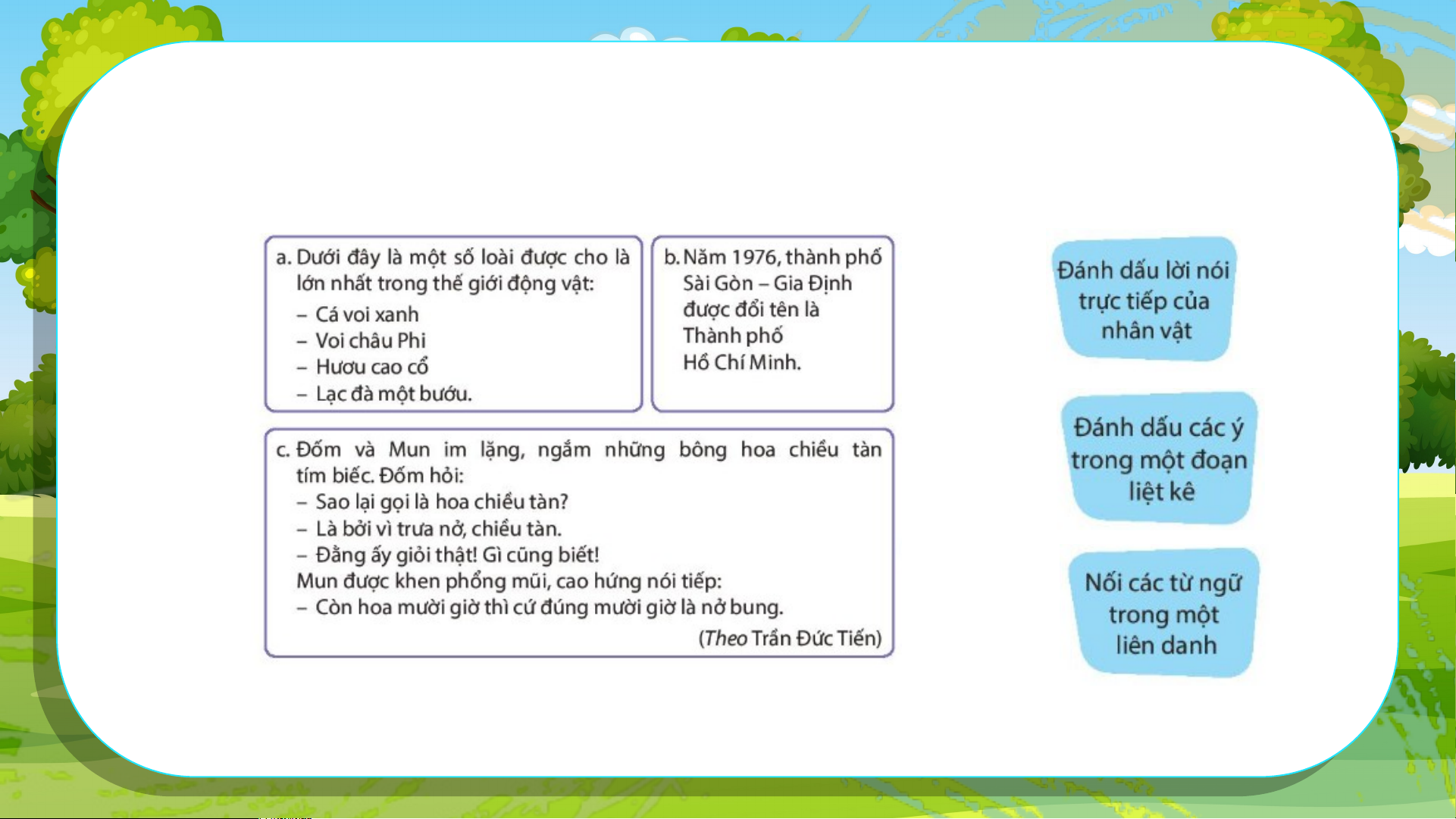 Nêu các tính từ chỉ màu xanh xanh mát, xanh bi c ế , xanh ng t ắ , xanh th m… ẳ . - Nh n ậ bi t ế đ c ượ công d n ụ g c a ủ d u ấ g ch ạ ngang KHÁM PHÁ 1. Xác đ n ị h công d n ụ g c a ủ d u ấ g ch ạ ngang đư c ợ s ử d n ụ g trong m i ỗ đo n ạ d i ướ đây: 2. Nêu công d n ụ g c a ủ d u ấ g ch ạ ngang trong m i ỗ trư n ờ g h p ợ sau: a. Đ ể tr n ồ g cây trong ch u