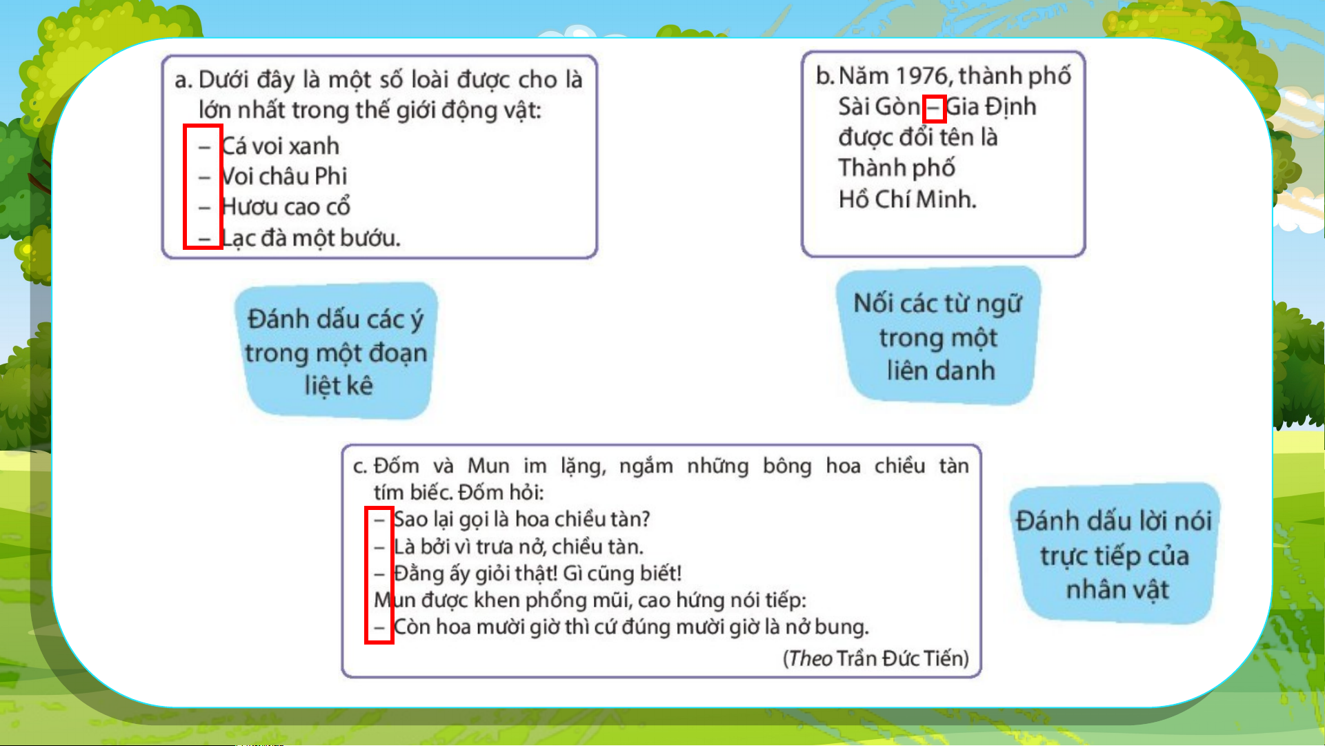 ở hành vào lúc 6 gi 3 ờ 0 phút. Dấu g c ạ h ngang có tác d ng ụ gì? Đánh dấu ch b ỗ ắt Chú thích đầu l i ờ nói Nối các t ừ ng t ữ rong m t ộ
