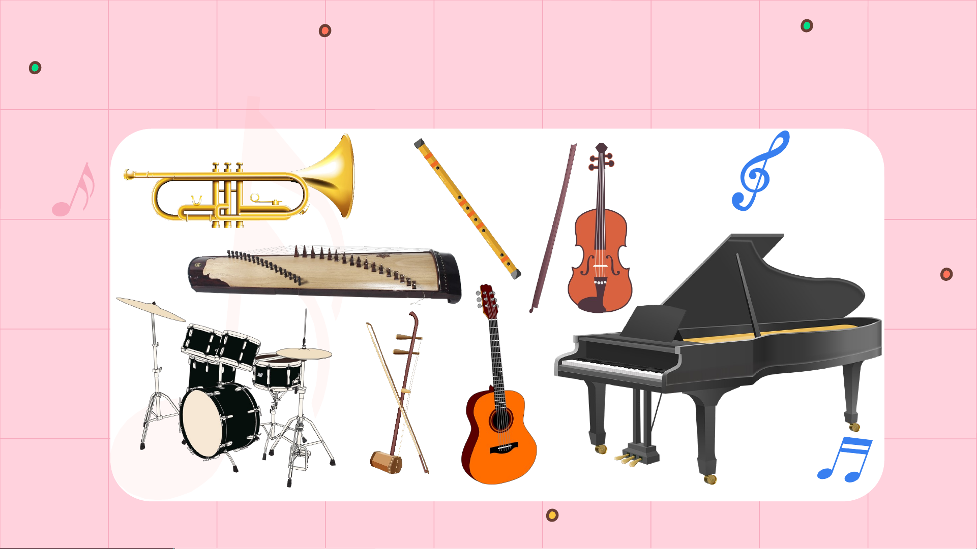 1. Những sự vật nào dưới đây được gọi là nhạc cụ? A. Tr n ố g đ n ồ g E. Chuông B. Pi-a-nô G. Vi-ô-lông C. Sáo trúc H. Còi D. Ghi-ta I. Trống c m ơ