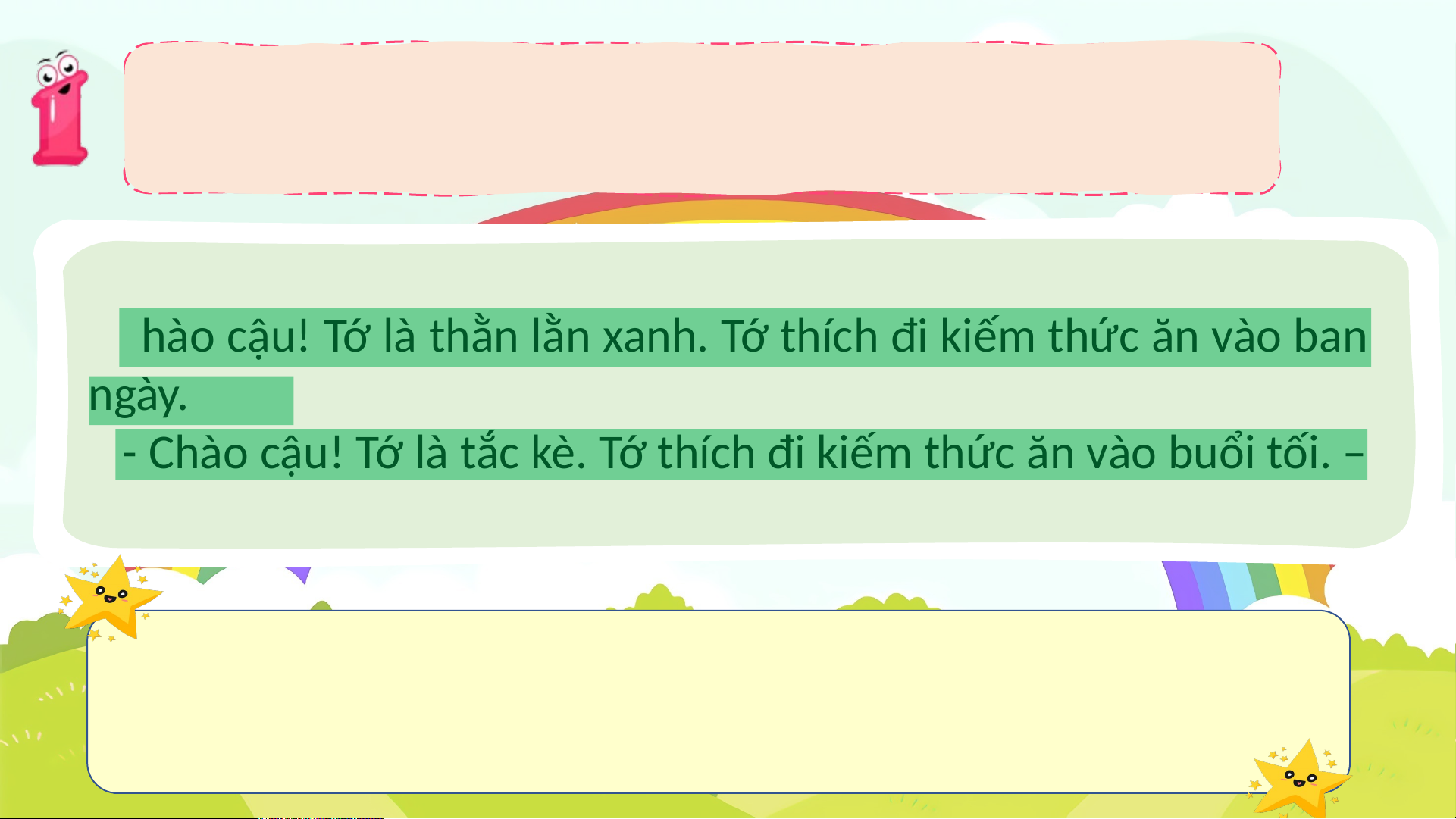 - Chào cậu! Tớ là tắc kè. Tớ thích đi kiếm thức ăn vào buổi tối. –