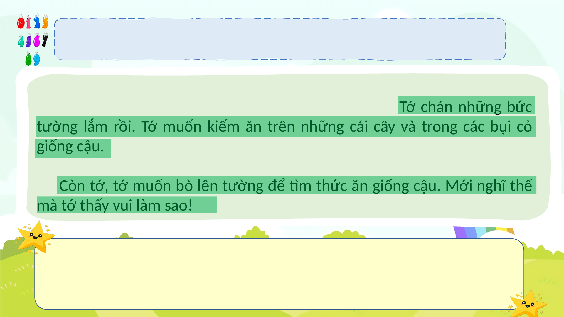 - Còn tớ, tớ muốn bò lên tường để tìm thức ăn giống cậu. Mới nghĩ thế mà tớ thấy vui làm sao!