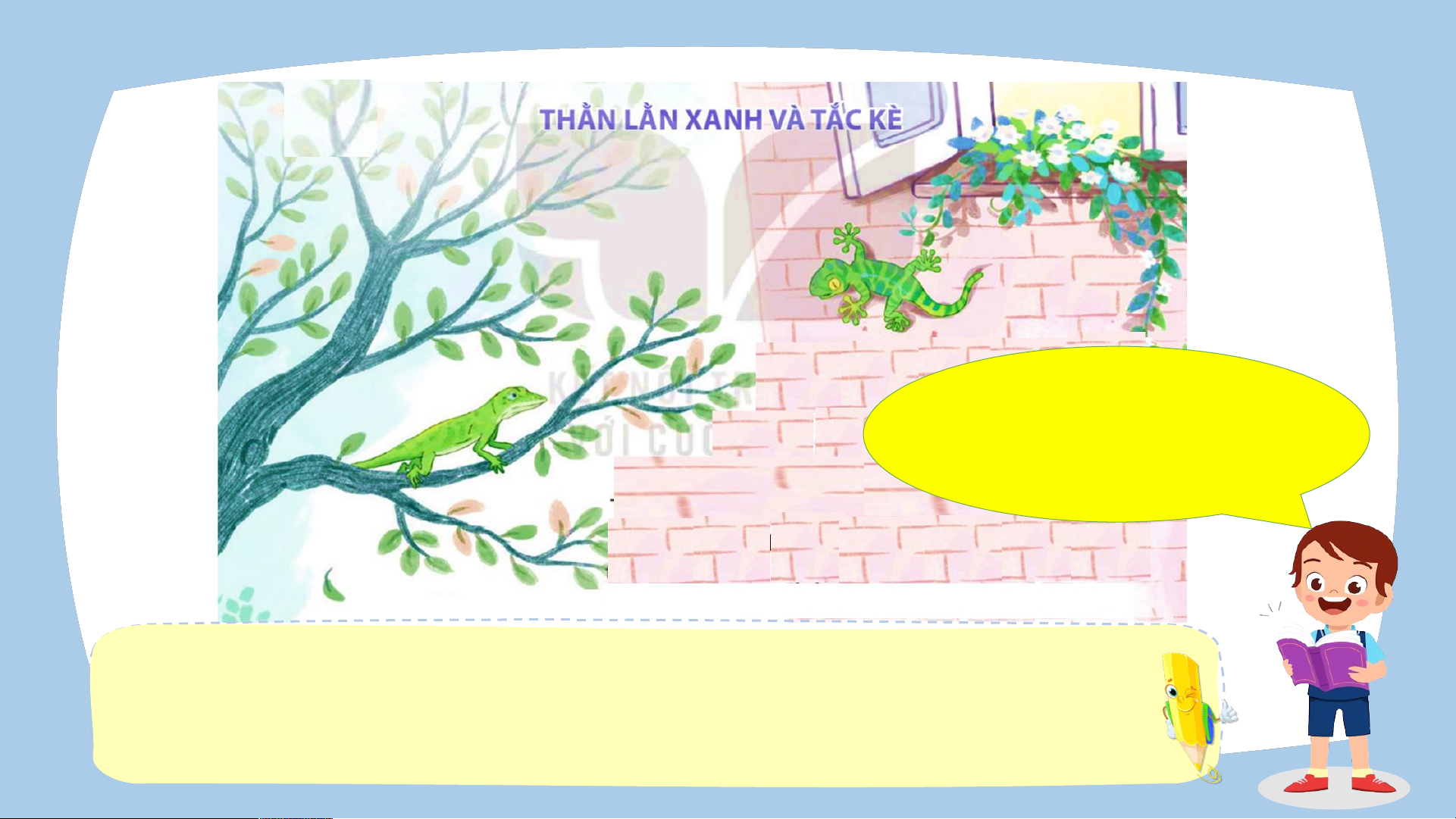 - Chào cậu! Tớ là tắc kè. Tớ thích đi kiếm thức ăn vào buổi tối. – Tắc kè đáp lời thằn lằn xanh.