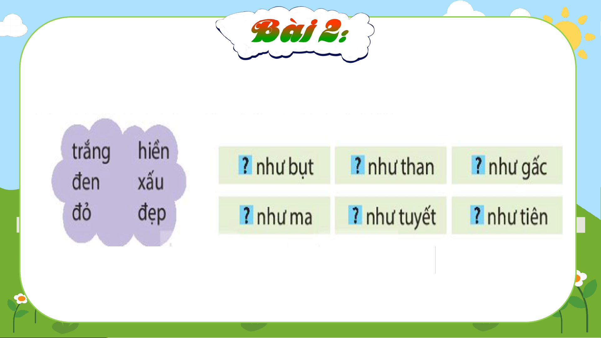 xấu, đẹp để hoàn thiện các thành ngữ. Hi n ề nh ư b t ụ Tr n ắ g nh ư tuy t ế Xấu nh ư ma Đỏ nh ư g c ấ 5 Đen nh ư than Đ p ẹ nh ư tiên