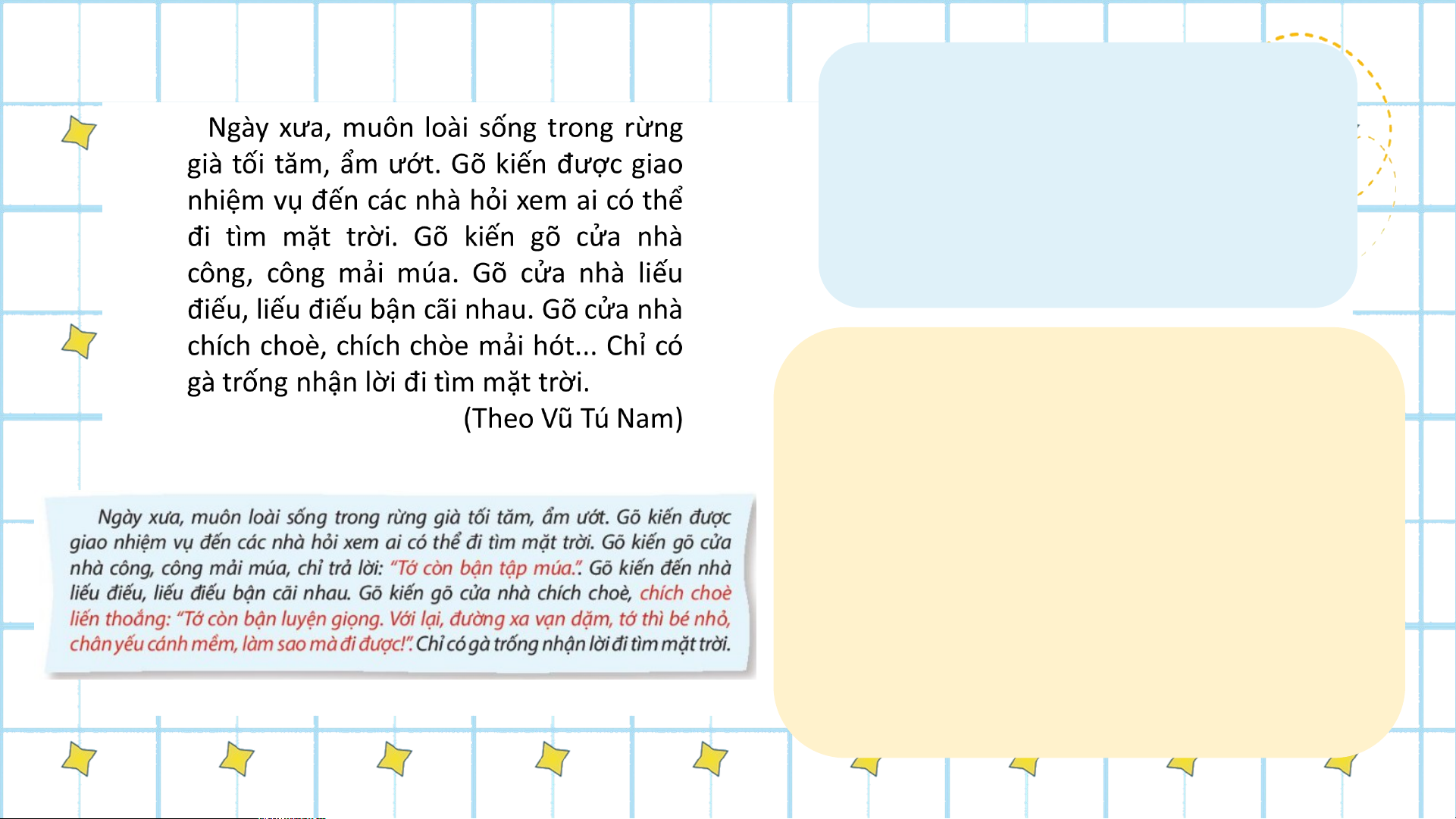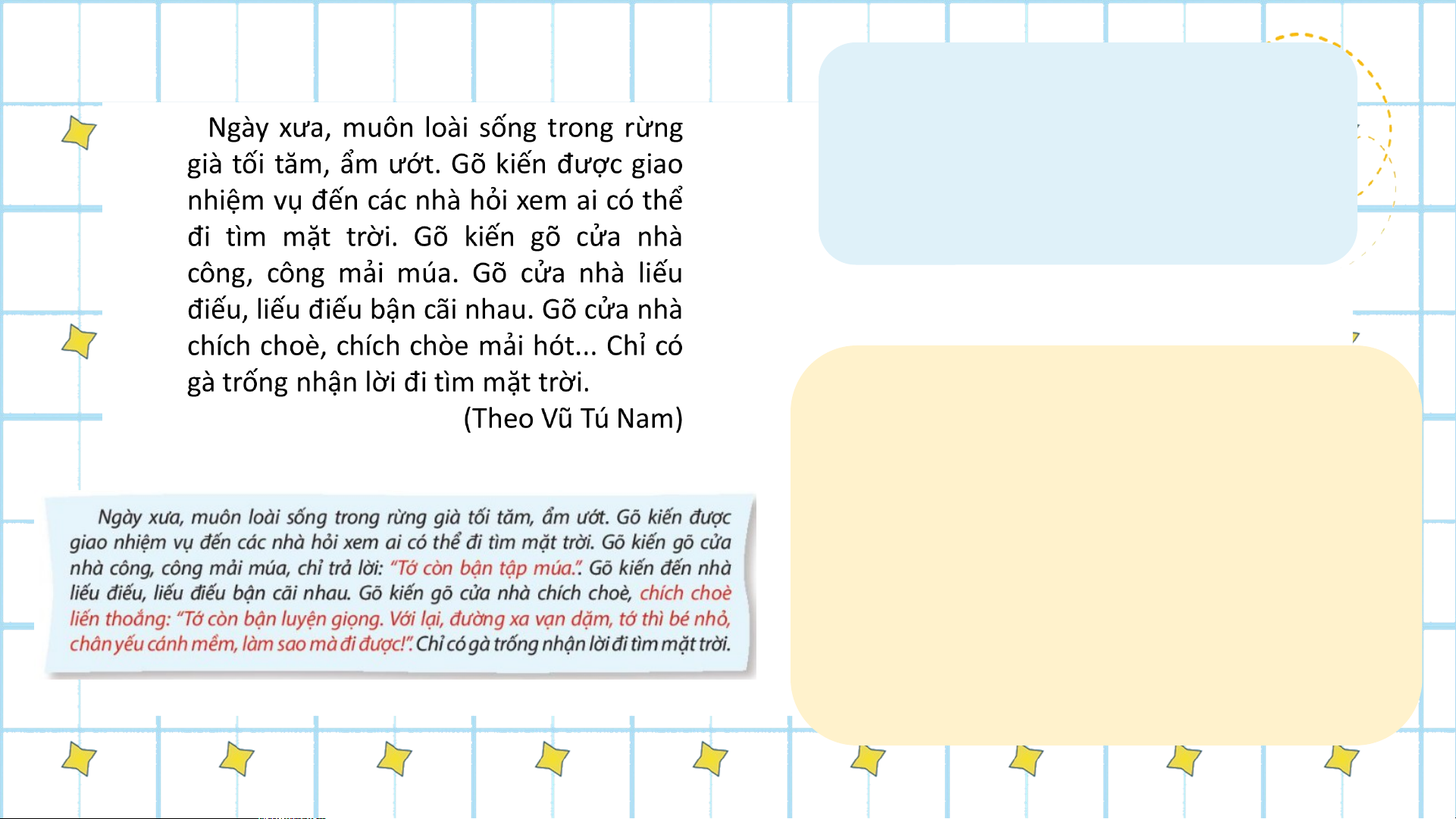 nhà chích choè, chích chòe mải hót... Chỉ có gà trống nhận lời đi tìm mặt trời. (Theo Vũ Tú Nam)