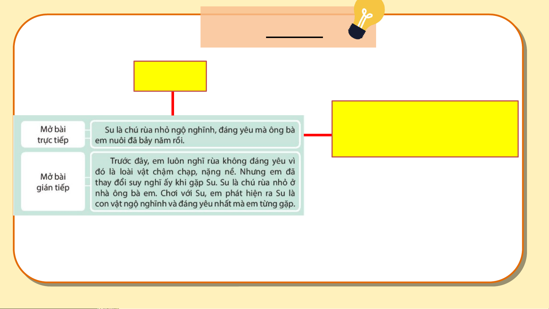 cảm xúc về chú rùa Su Hoàn thành phi u ế h c ọ t p ậ Các đoạn văn Hình th c ứ N i ộ dung MB tr c ự ti p ế Ngắn g n ọ Gi i ớ thi u ệ ngay v ề con v t ậ D n ẫ d t ắ v ề các SV, hi n ệ MB gián ti p ế Nhi u ề h n 1 ơ câu tư ng