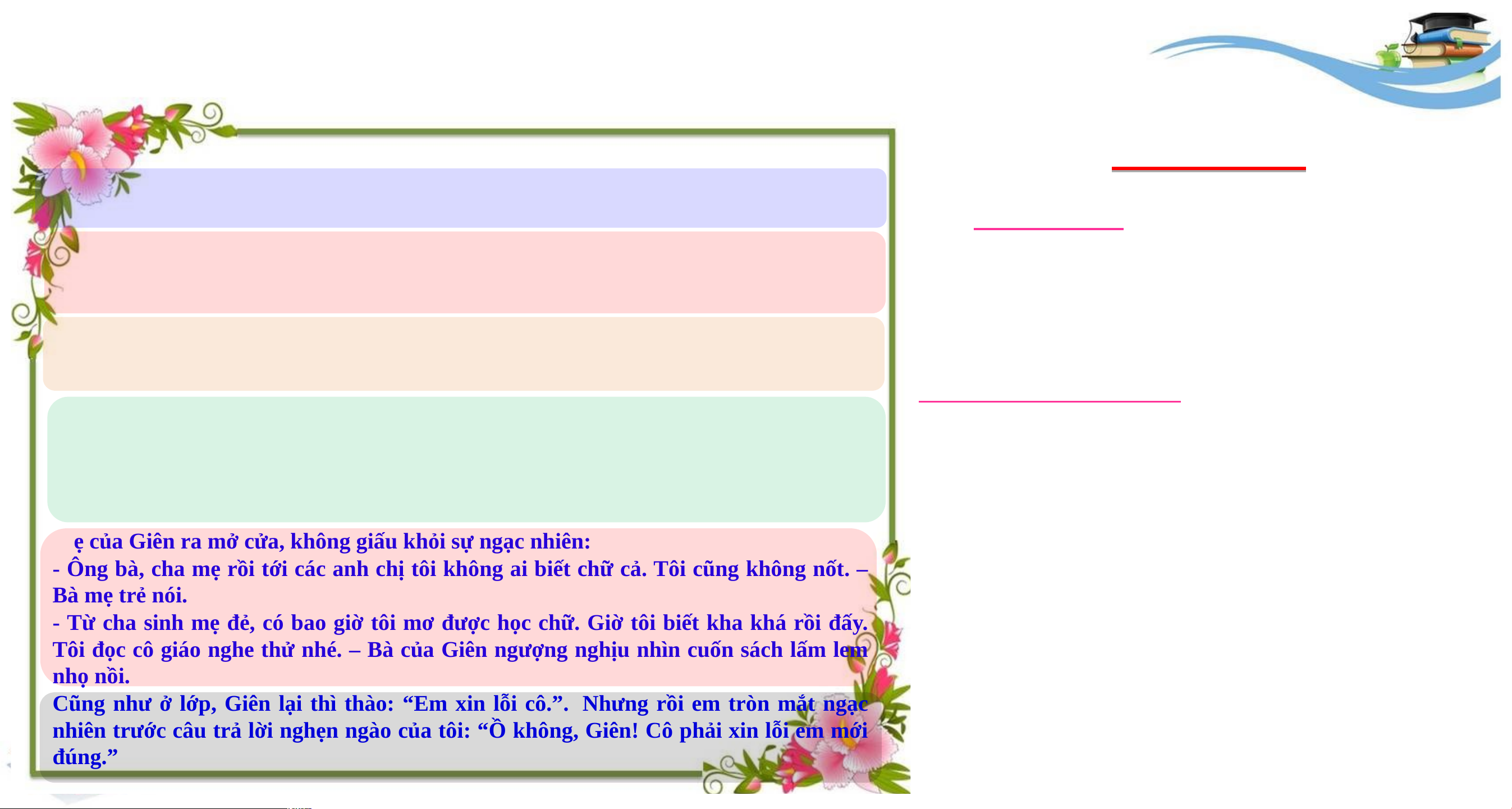 ngạc nhiên trước câu trả lời nghẹn ngào của tôi: “Ồ không, Giên! Cô phải xin lỗi em mới đúng.” từng có).