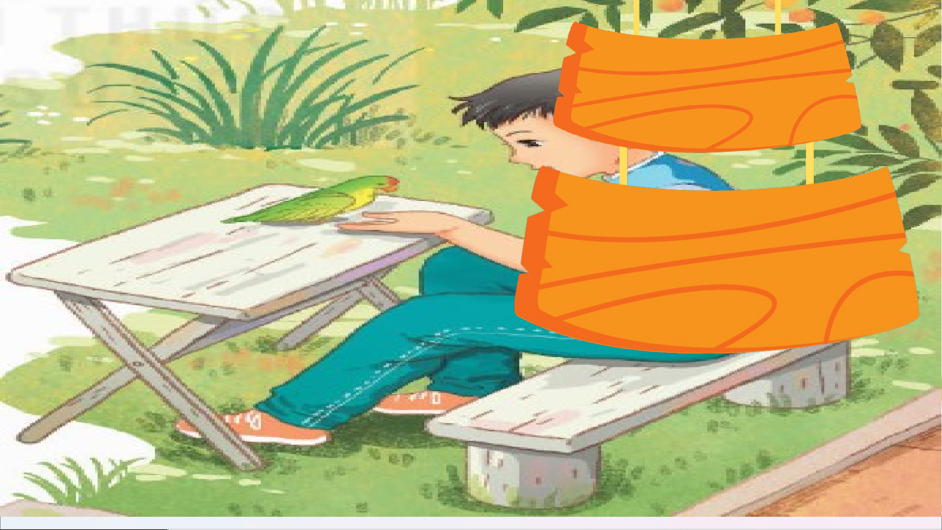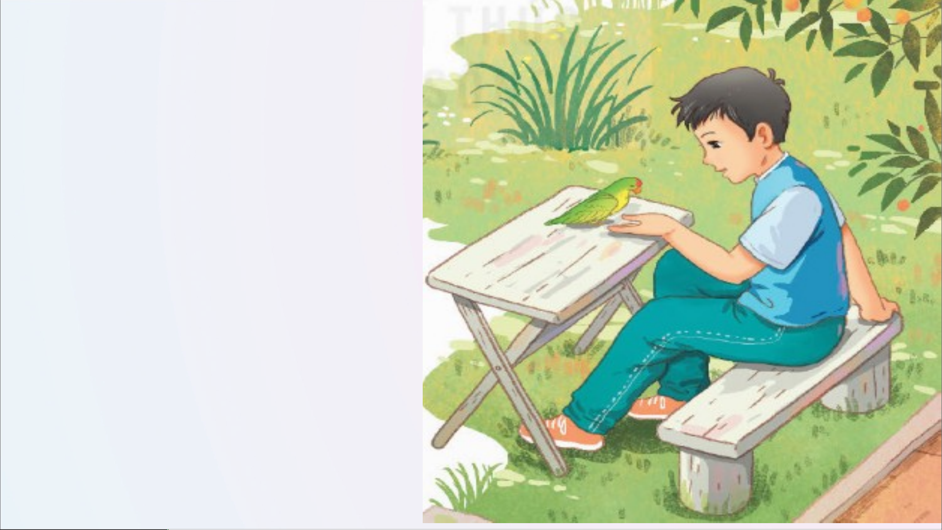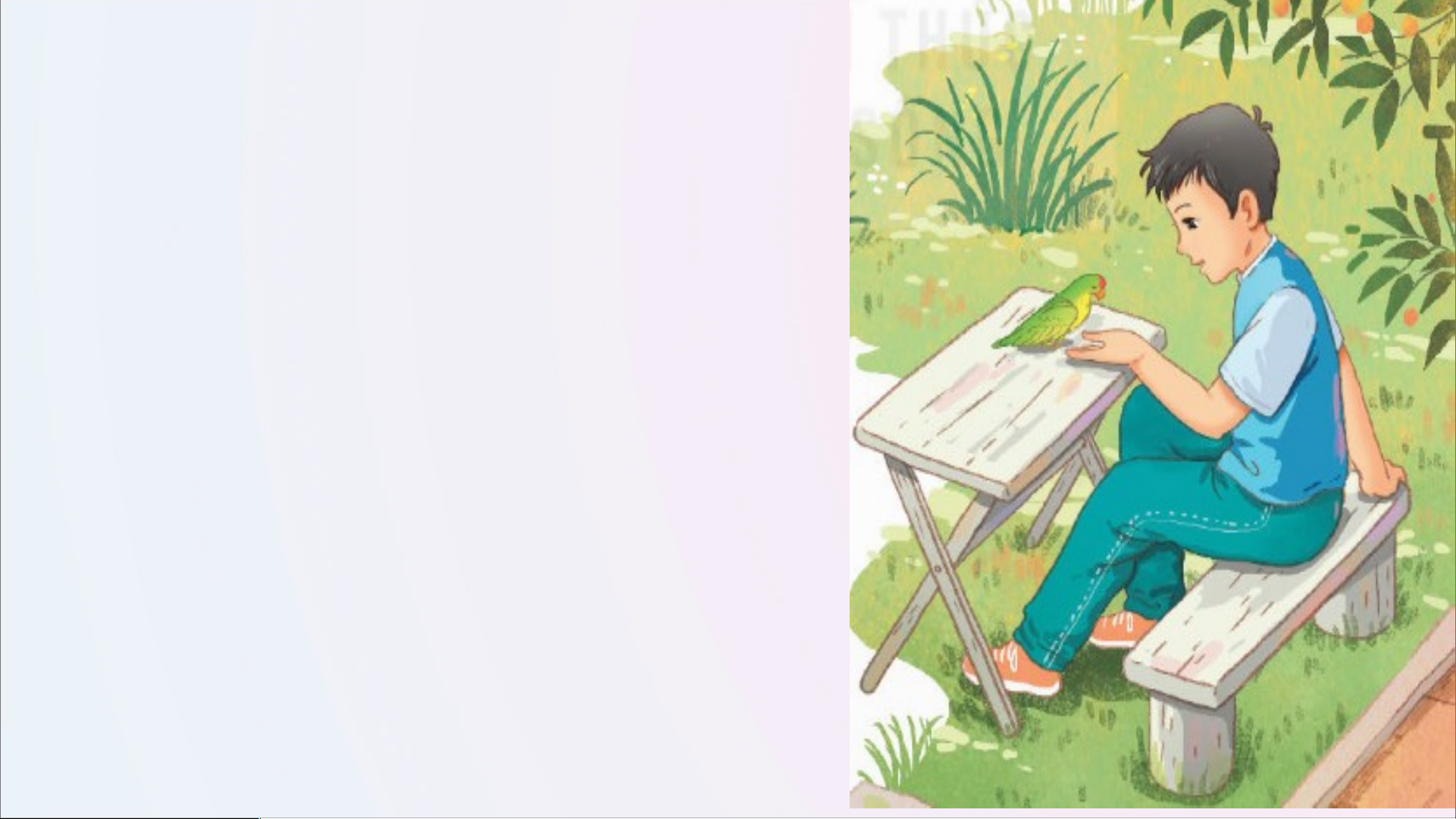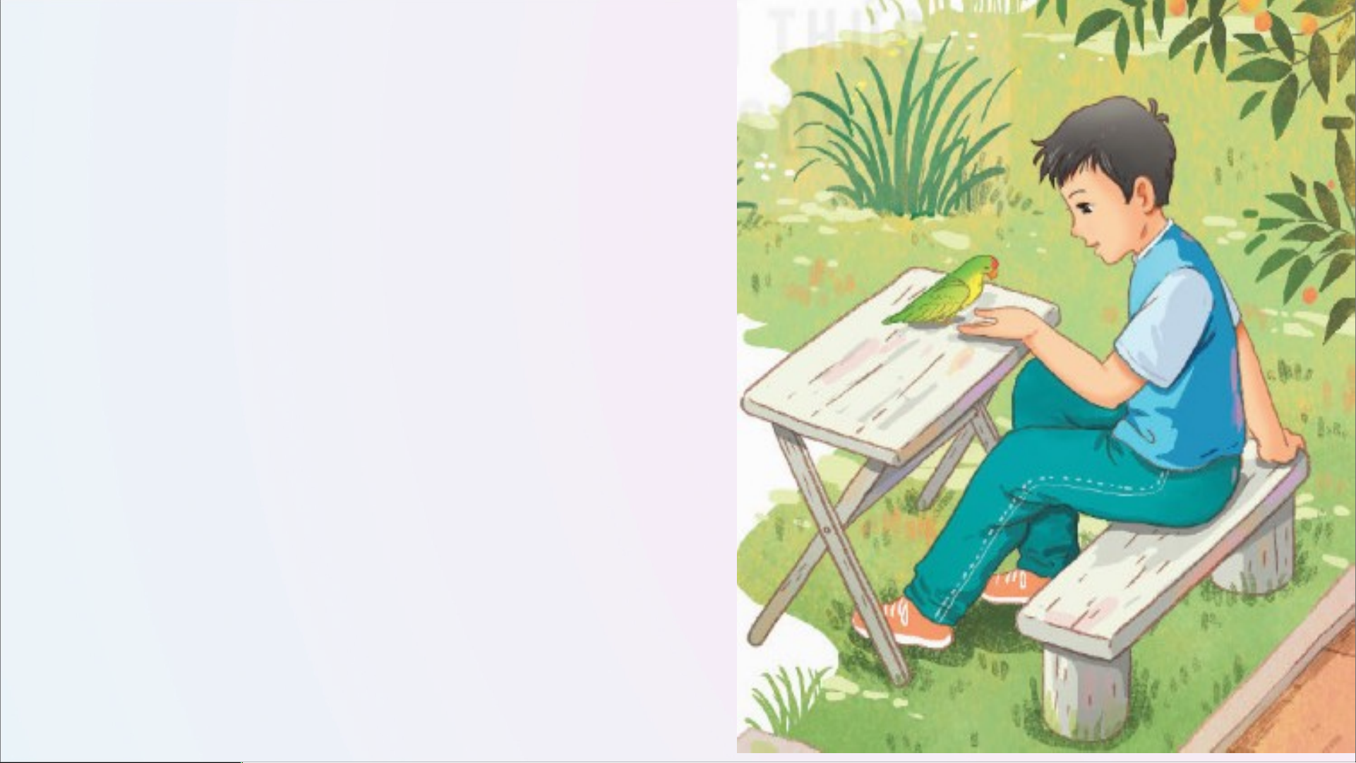 - Đi học về, Tú chạy đến bên con vẹt nhỏ.