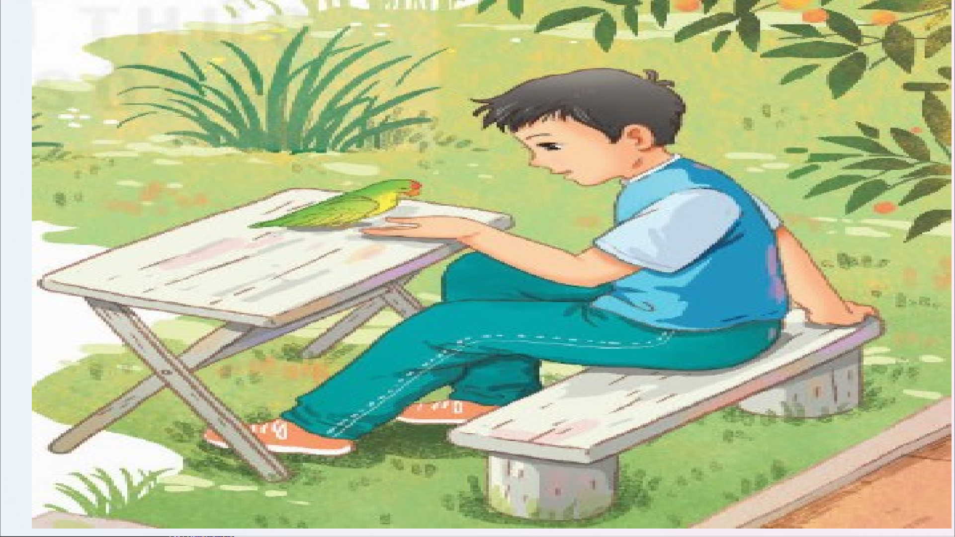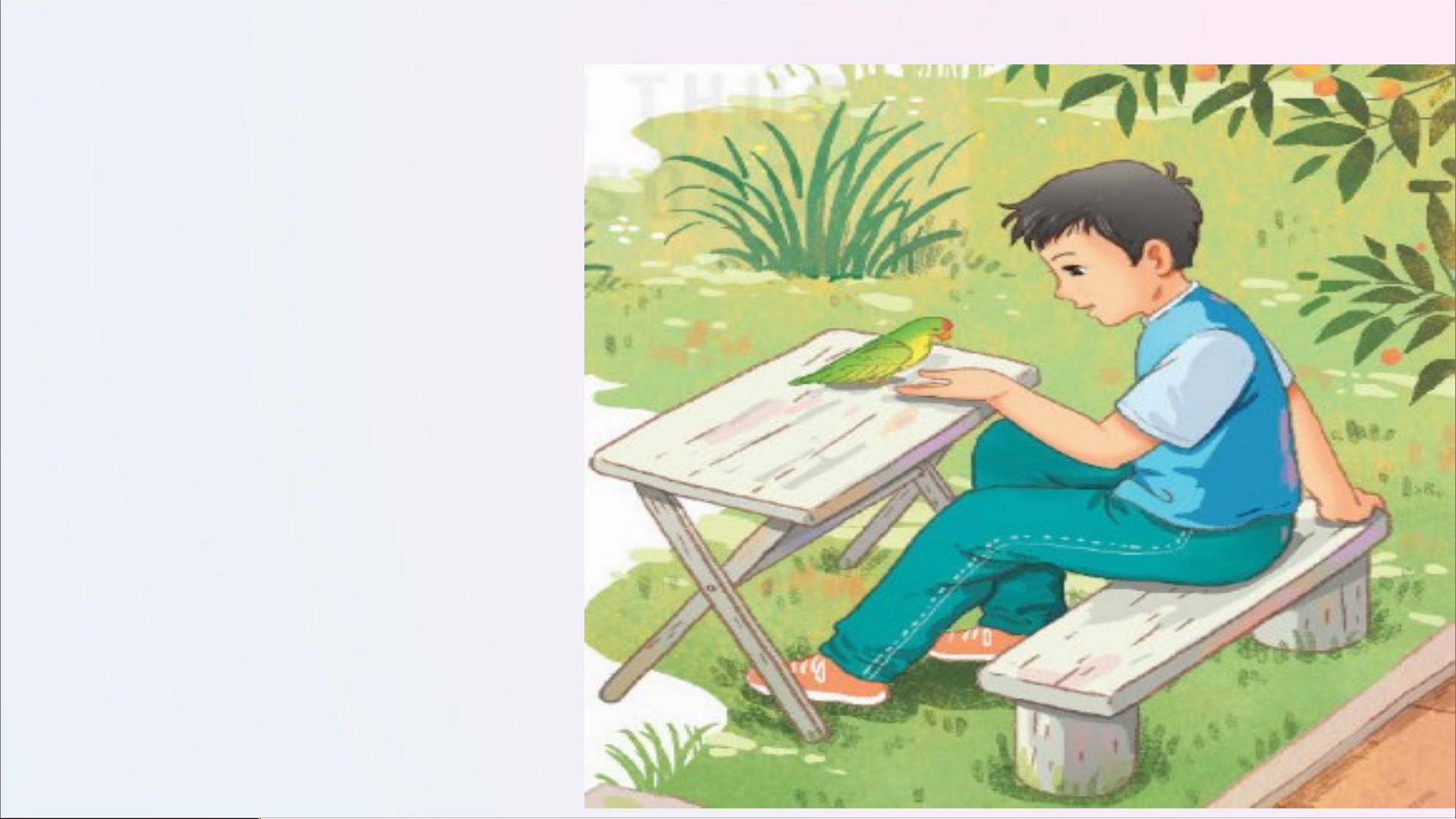 Đi học về, Tú chạy đến bên con vẹt nhỏ. Nhận ra Tú, vẹt nhảy nhót há mỏ