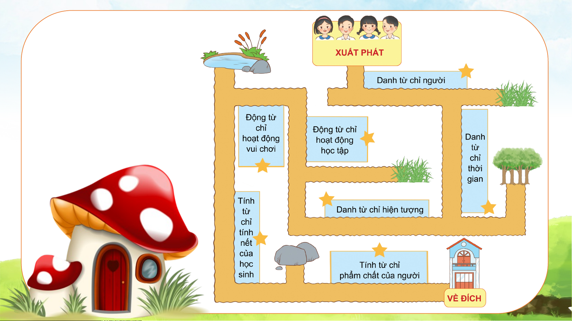 cầu ghi trên mỗi thẻ: Vạn Lý Trường Kim Tự Tháp Thành 2.2 Tìm danh từ, động từ, tính từ 2. Tìm 2 – 3 từ theo yêu cầu ở mỗi thẻ có trên đường đi. THẢO LUẬN NHÓM 4 Trò chơi tiếp trước sức Chia lớp sẻ ông, bà, cha mẹ, ..... giờ, nhảy đọc sách, giây, dây, đá viết bài, học phút bóng, . thuộc,.... ngày ... .... vui nắng, mưa, gió, bão... vẻ, hồn nhiên , trẻ dũng cảm, nhân hậu, con... thật thà...... 2.3 Viết đoạn văn ngắn