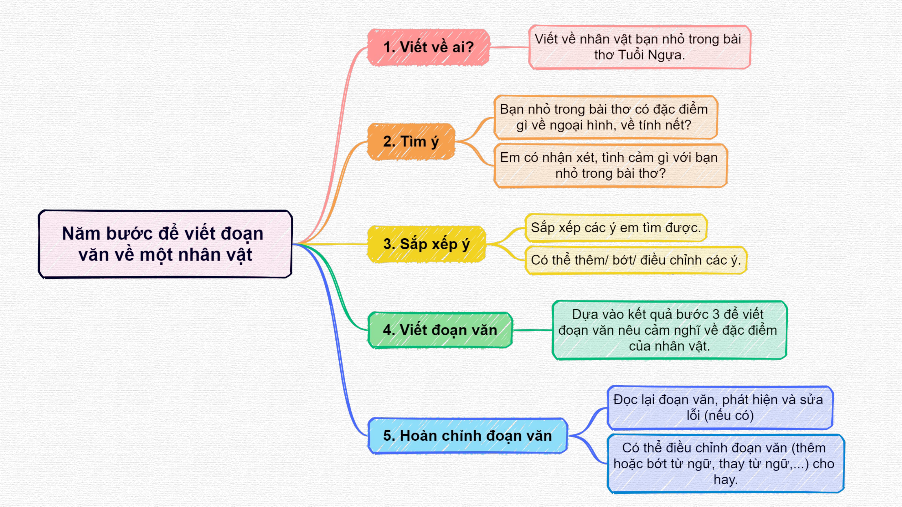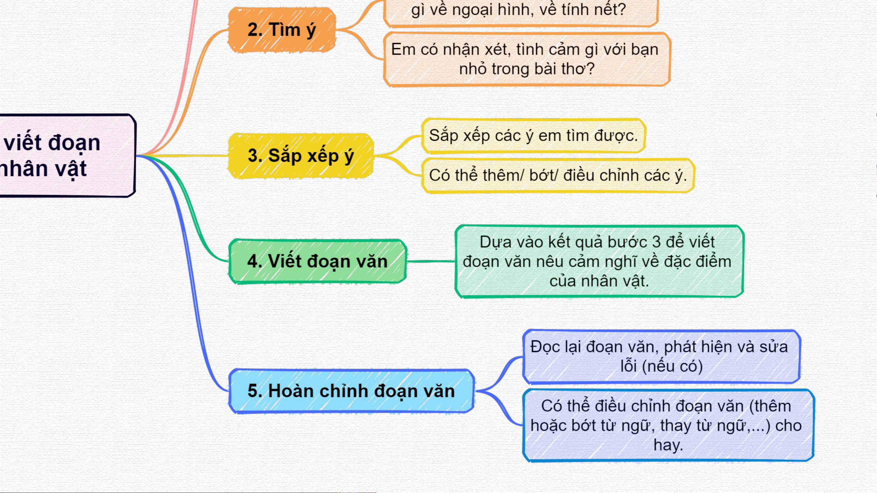 3. Dựa vào yêu cầu của bài tập và quy tắc Bàn tay, xác định những việc cần làm: 3. Sắp xếp 4. Viết 5. Hoàn chỉnh 1. Viết về ai? 2. Tìm ý các ý. đoạn văn đoạn văn