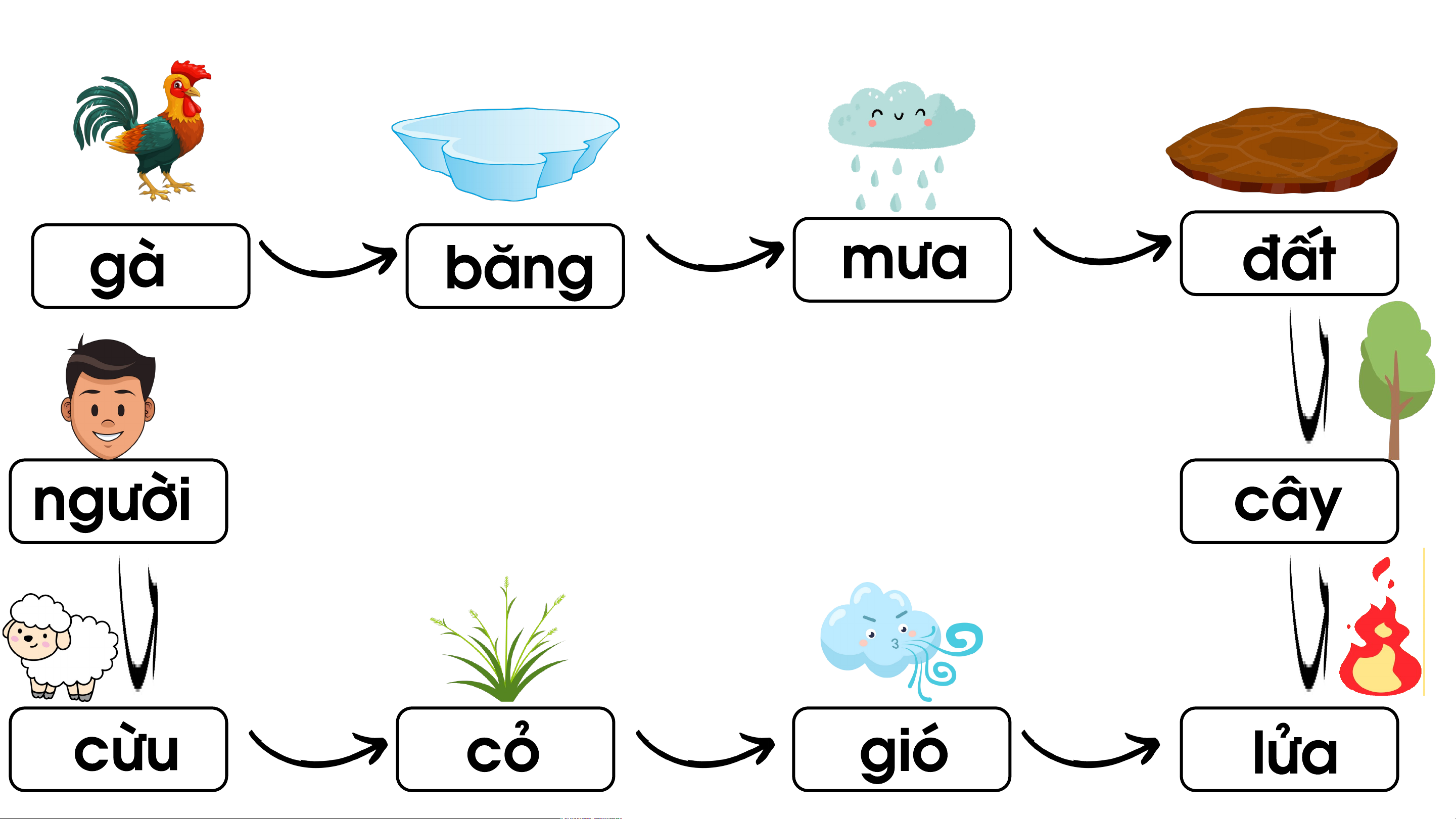 cây, trồng cỏ, tạo ra lửa; biết nhờ