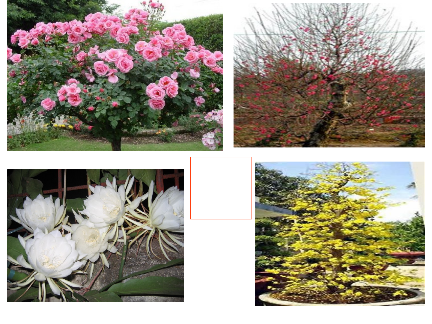 chi tiết từng bộ phận; quan sát sự vật, hoạt động liên quan đến cây). Cây bưởi Cây mít Cây dừa Cây ăn quả Hoa hồng Cây hoa đào Cây hoa Cây hoa quỳnh Cây mai vàng ấ ủ ộ 2. Em nghe th y ấ ti n