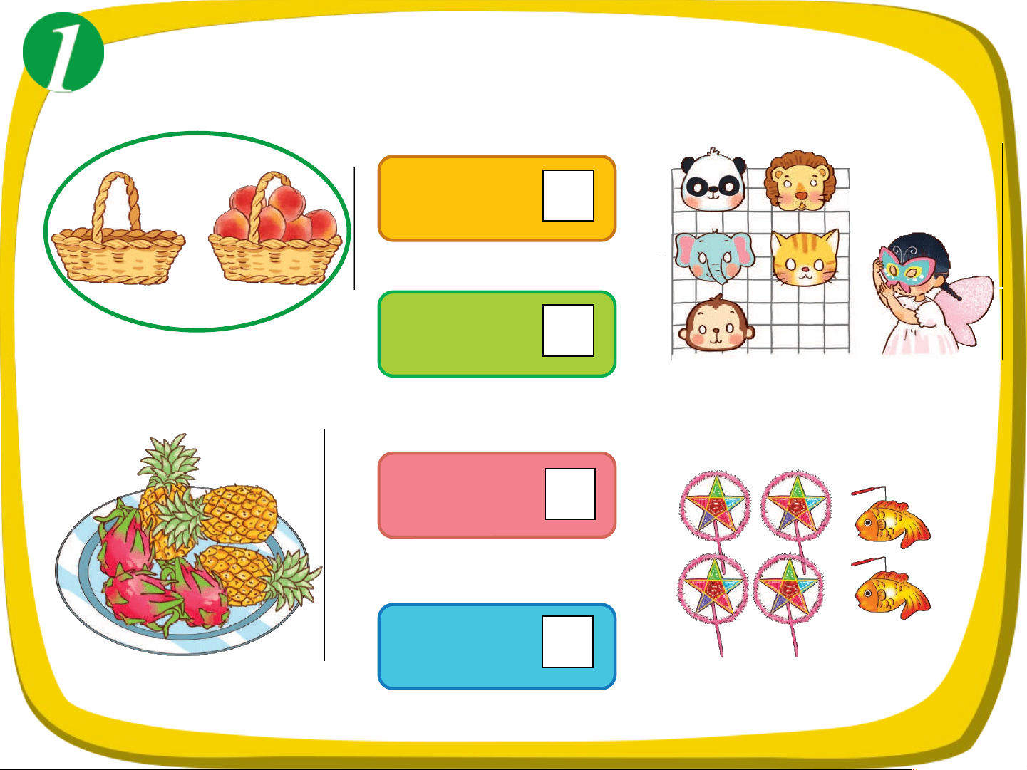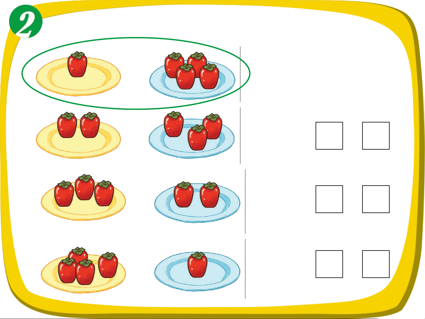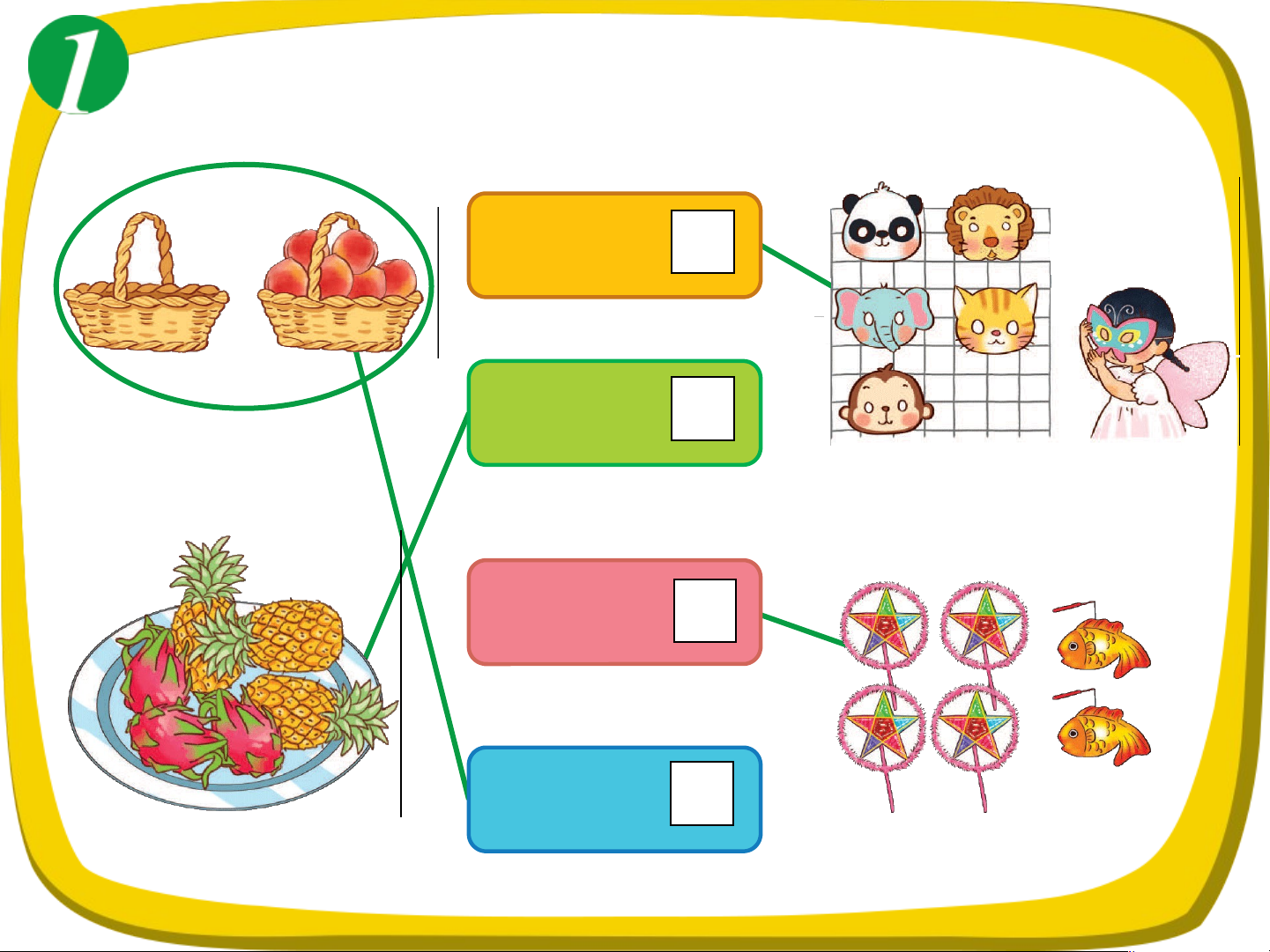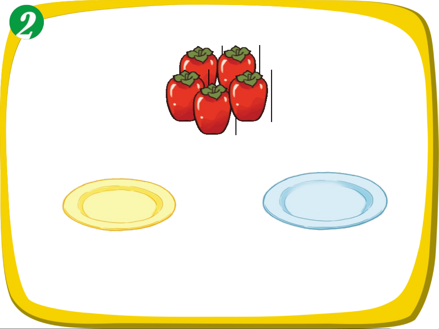 Quan sát mỗi cách xếp 5 quả hồng vào 2 đĩa rồi nêu số. 5 = 1 + 4 5 = ? + ? 5 = ? + ? 5 = ? + ?