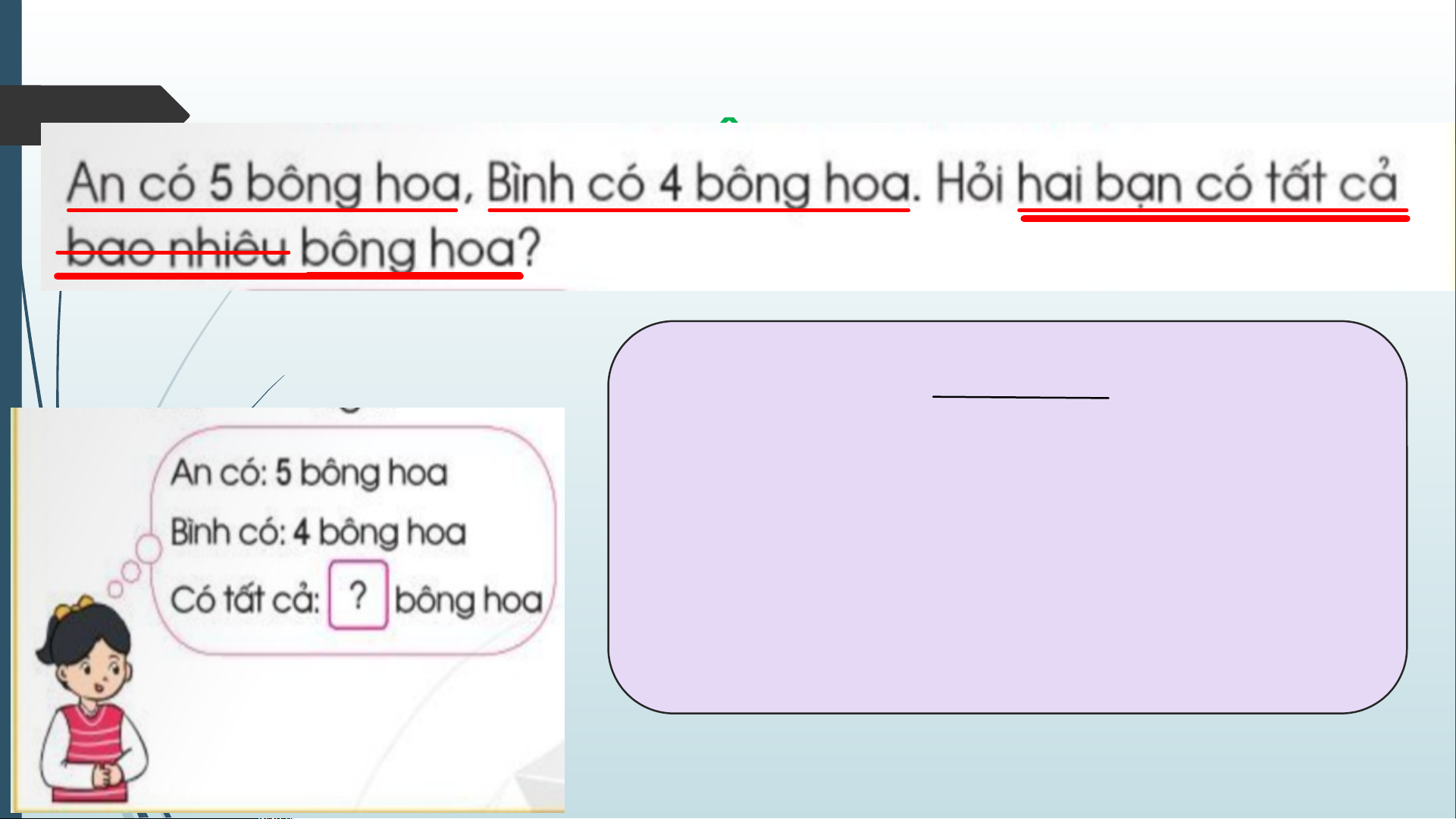 Hai bạn có tất cả số bông hoa là : 5 + 4 = 9 (bông) Đáp số : 9 bông hoa. số Tóm tắt Bài giải