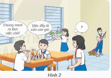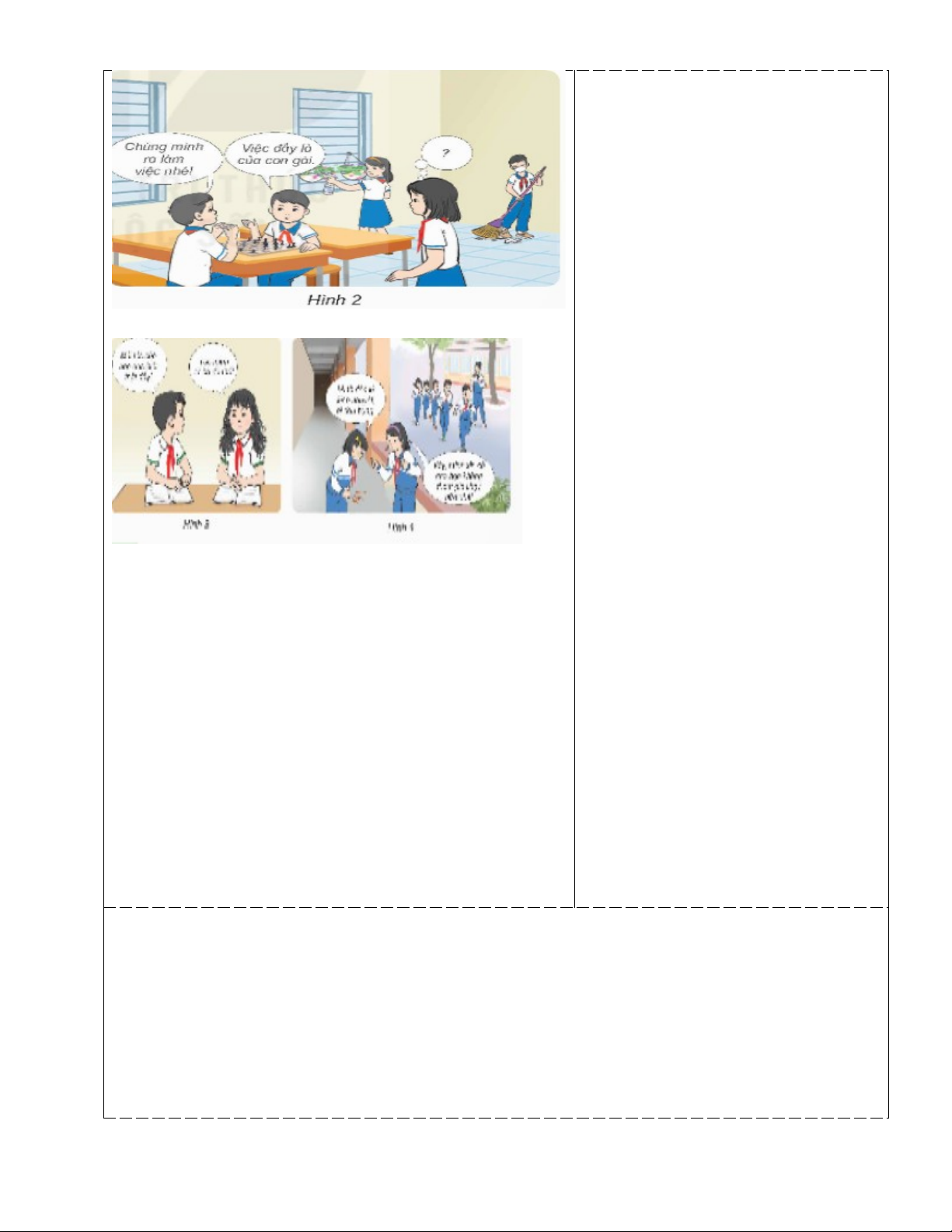 - GV mời đại diện các nhóm báo cáo kết quả thảo luận. Chia sẻ trước lớp. - GV nhận xét, tuyên dương. GV yêu cầu HS kể những tình huống em thấy ở trong lớp đã thể hiện thái độ tôn trọng bạn cùng giới, khác giới? GV nhận xét và khen học sinh | - HS đọc thông tin và thảo luận theo nhóm: Hình 2: Một bạn nam trong lớp thể hiện chưa tôn trọng bạn nữ qua lời nói “Việc đấy là của con gái”. Các bạn gái khác có ý thức và thực hiên tố công việc. Vì trực nhật là công việc chung của học sinh không phân biêt trai hay gái. Nêu là em thì em sẽ tham gia làm trực nhật cùng các bạn. Hình 3: Bạn nam qua lời nói đã thể hiện sự tôn trọng những đặc điểm khác biệt, đặc điểm sinh ra đã có cử bạn. Vì đây là đặc điểm sinh học không thể thay đổi theo thời gian. Nếu là em thì em sẽ luôn động viên bạn để bạn không tự ti. Hình 4: Bạn nữ đã thể hiện sự tôn trọng đặc điểm sinh học của bạn mình, đưa ra phương án phù hợp vì lợi ích bảo vệ sức khoẻ của bạn. Nếu là em em cũng sẽ thực hiện như bạn ấy. HS trả lời: Thấy bạn gái trực nhật muộn bạn Thắng tới làm phụ; Thấy Hoa bị sốt Mai xin phép cô giao đưa Mai đến phòng y tế,… | |