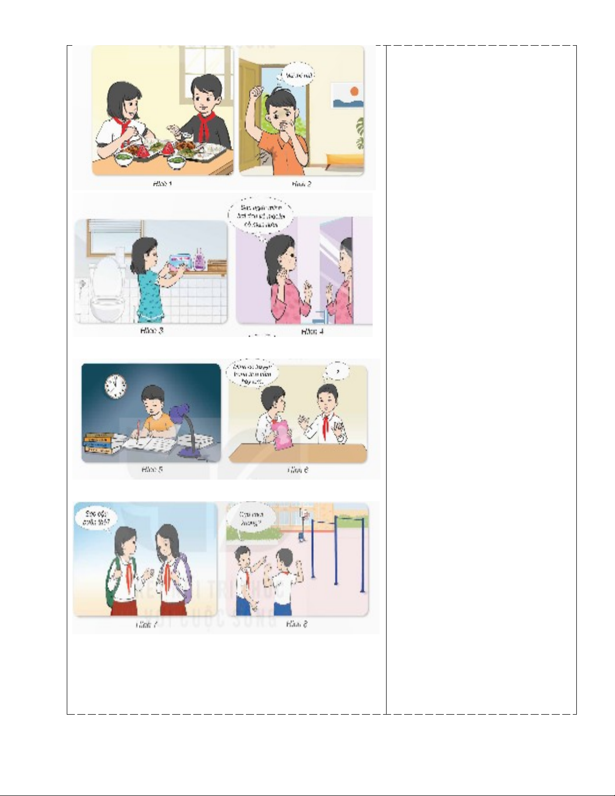 - GV mời đại diện các nhóm báo cáo kết quả thảo luận. Chia sẻ trước lớp. - GV nhận xét, tuyên dương. GV nhận xét và khen học sinh Hoạt động khám phá 2: Kể những việc cần làm, khác với việc đã nêu ở hoạt động 1 để chăm sóc bảo vệ sức khỏe thể chất và tinh thần tuổi dậy thì phù hợp học sinh. - GV yêu cầu học sinh làm việc cá nhân, khuyến khích các học sinh liệt kê càng nhiều càng tốt. - Giáo viên nhận xét nhấn mạnh những việc làm hoạt động thường thực hiện ở trường ở nhà nhằm chăm sóc bảo vệ sức khỏe. | - HS đọc thông tin và thảo luận theo nhóm: Hình 1: ăn uống đủ lương đủ chất. Hình 2: tắm và vệ sinh cơ thể hằng ngày đặc biệt sau khi vận động cơ thể. Hình 3: thay băng vệ sinh khi có kinh nguyệt Hình 4: Chia sẻ với người lớn về những thay đổi của cơ thể. Hình 5: không thức khuya Hình 6: không tò mò đọc truyện về tình cảm nam nữ Hình 7: chia sẻ động viên khi bạn buồn Hình 8: Tham gia các hoạt động thể thao vận động cơ thể. Một số việc có thể nêu: như tập thể dục, vận động giữa giờ, làm việc nhà, quét nhà, lau dọn nhà cửa, tưới cây, ăn hết suất ăn theo quy định, uống đủ nước, vệ sinh cơ quan sinh dục hằng ngày, khám sức khỏe đầu năm, khám răng định kỳ, ngủ trưa đầy đủ, tham gia hoạt động giải trí lành mạnh. | ||||||