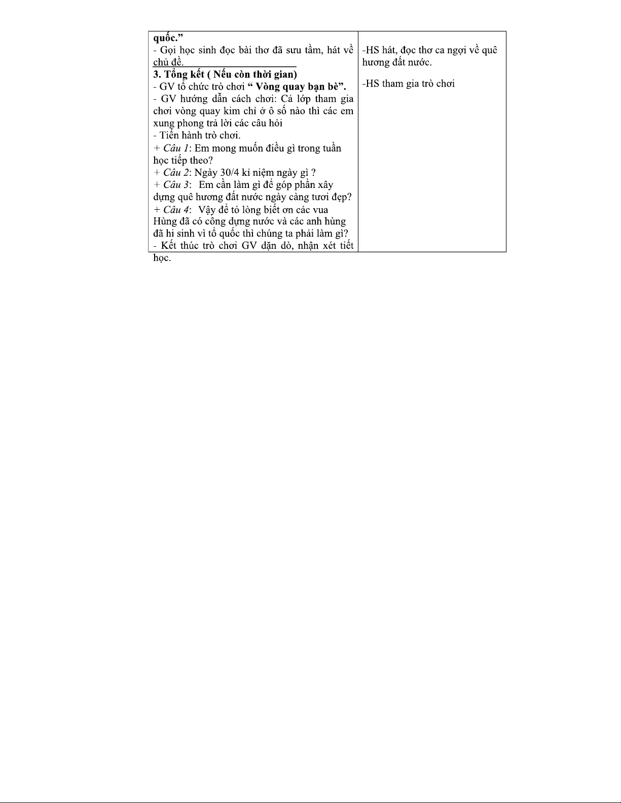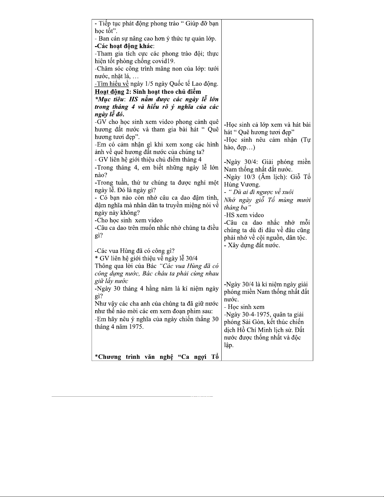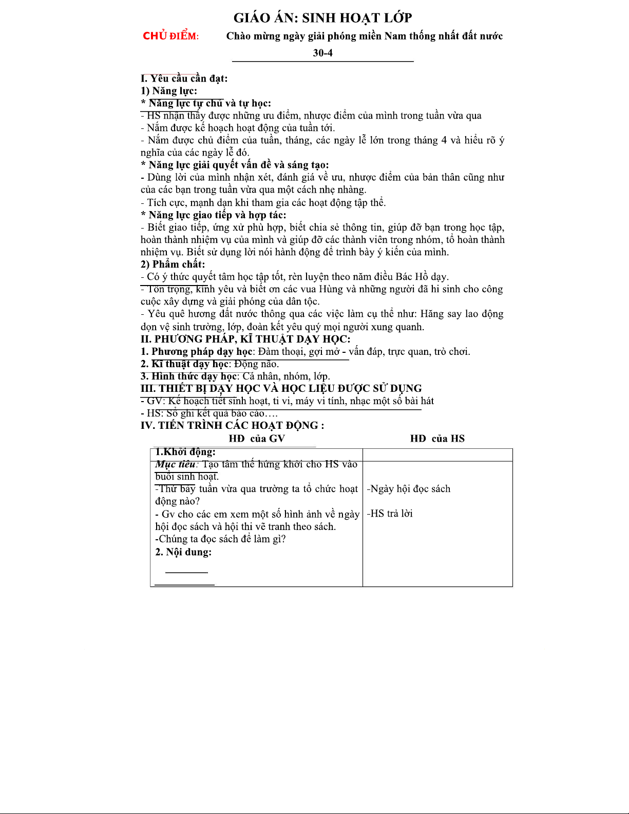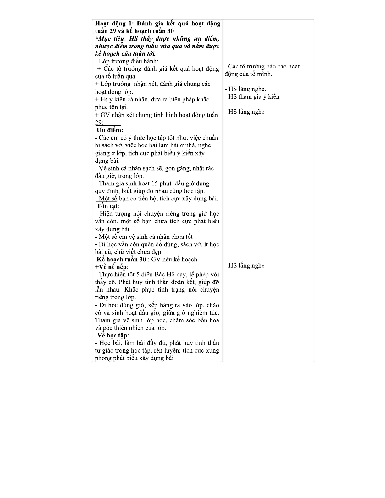 Giáo án Sinh hoạt lớp mẫu - Giới thiệu và Kế hoạch hoạt động tuần 30