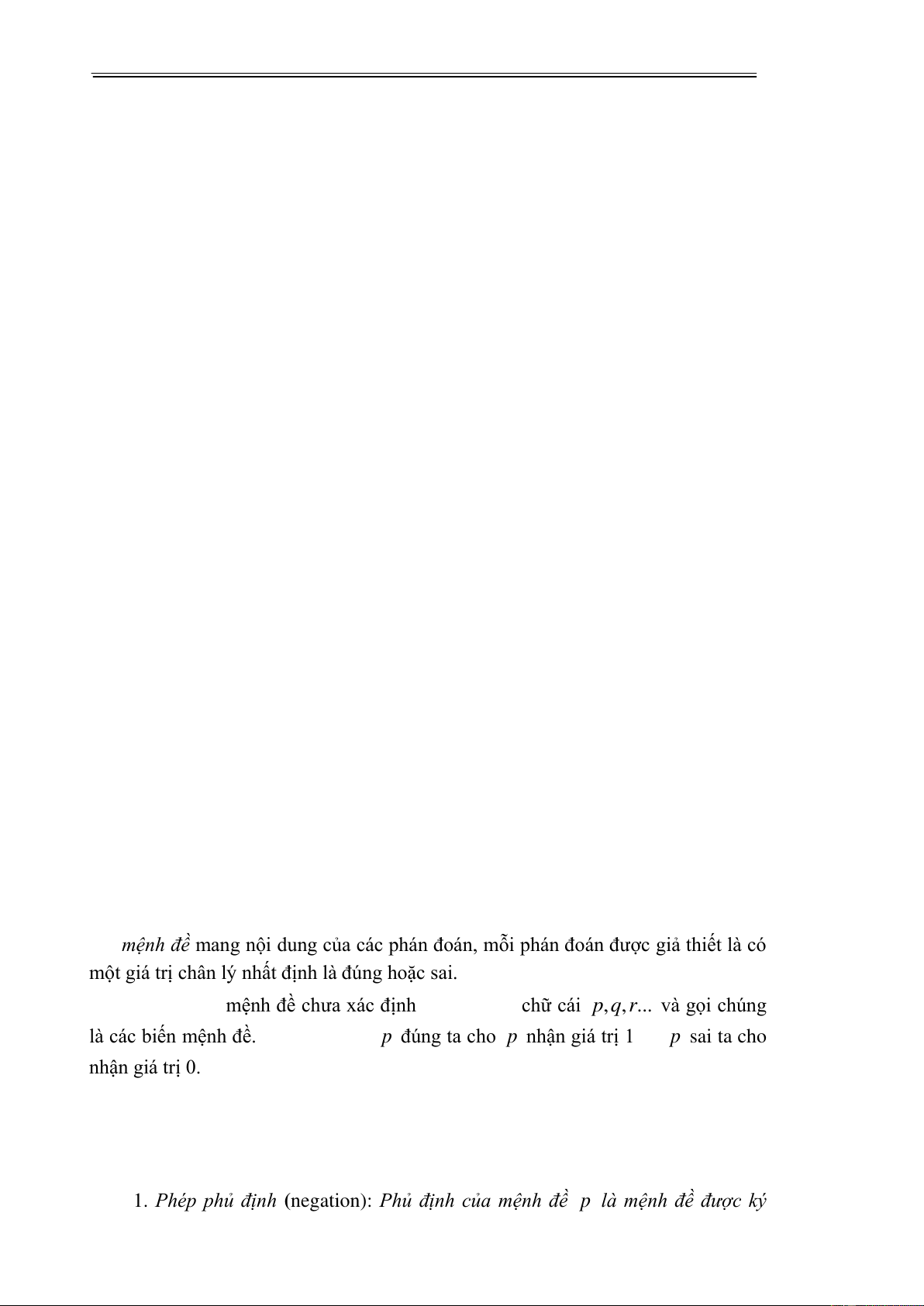 hiệu p đọc là không p . Mệnh đề p đúng khi p sai và p sai khi p đúng.