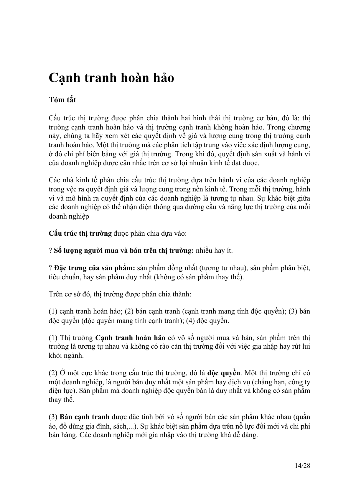 (1) cạnh tranh hoàn hảo; (2) bán cạnh tranh (cạnh tranh mang tính độc quyền); (3) bán