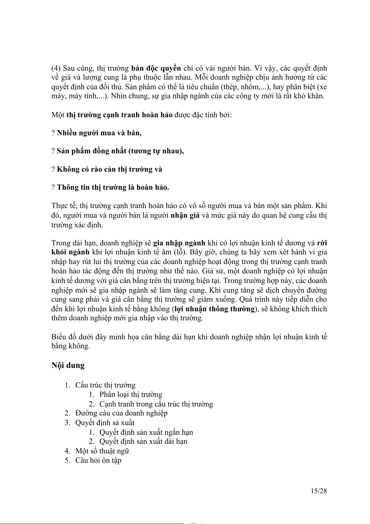 Biểu đồ dưới đây minh họa cân bằng dài hạn khi doanh nghiệp nhận lợi nhuận kinh tế bằng không. Nội dung 1. Cấu trúc thị trường