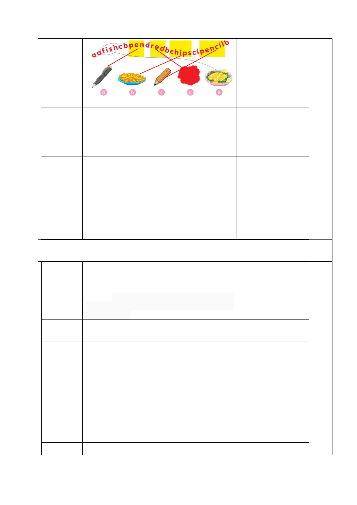 - identify some learnt words bell, pen, pencil, red, chips and fish.