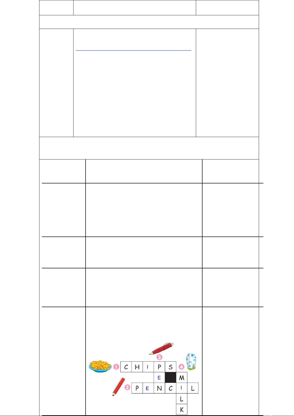 - say the words (chips, milk, pen, pencil…) they have learnt. II. INPUT Language: