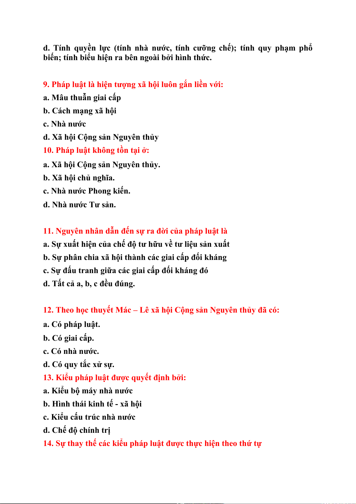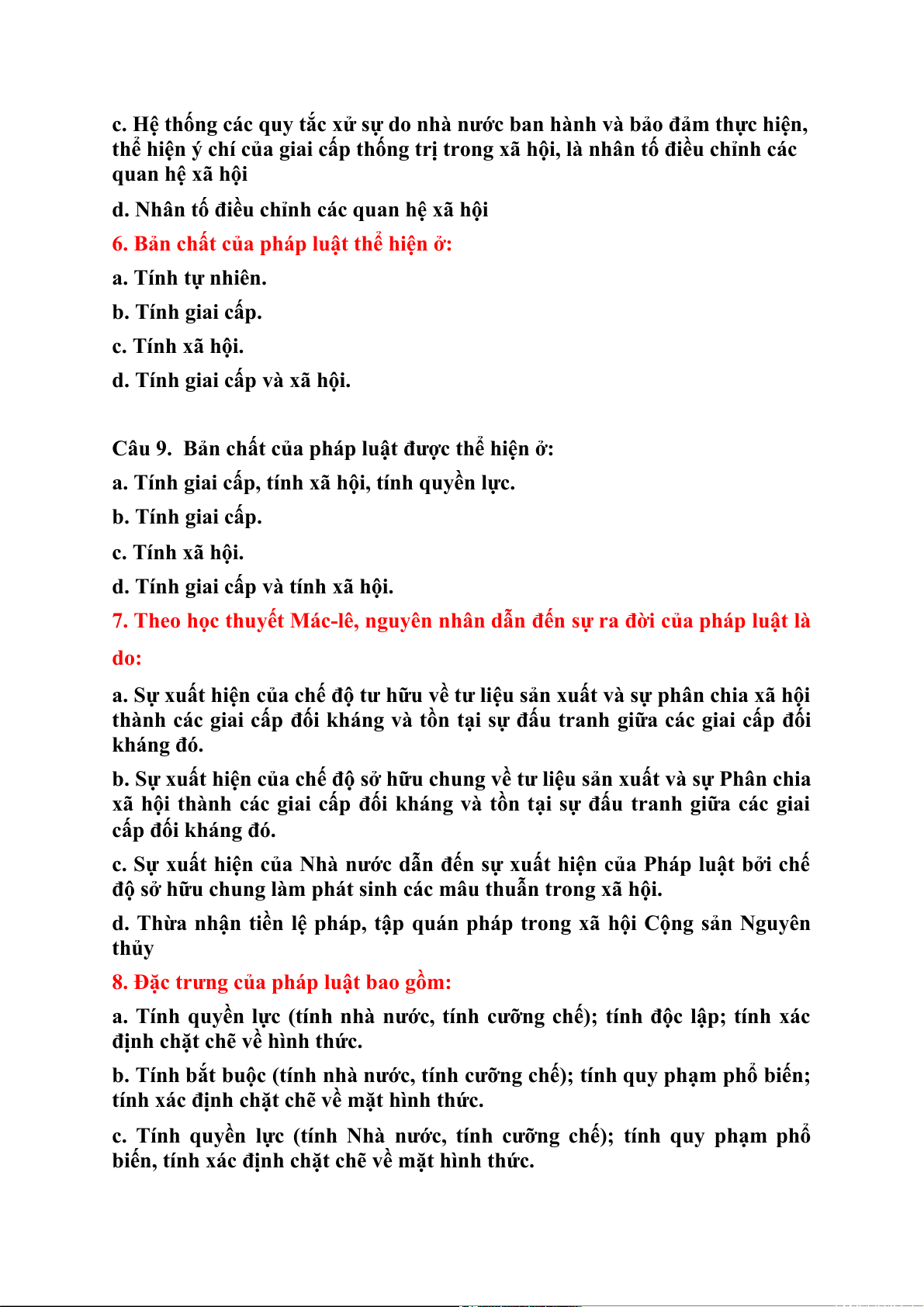 9. Pháp luật là hiện tượng xã hội luôn gắn liền với: a. Mâu thuẫn giai cấp b. Cách mạng xã hội c. Nhà nước