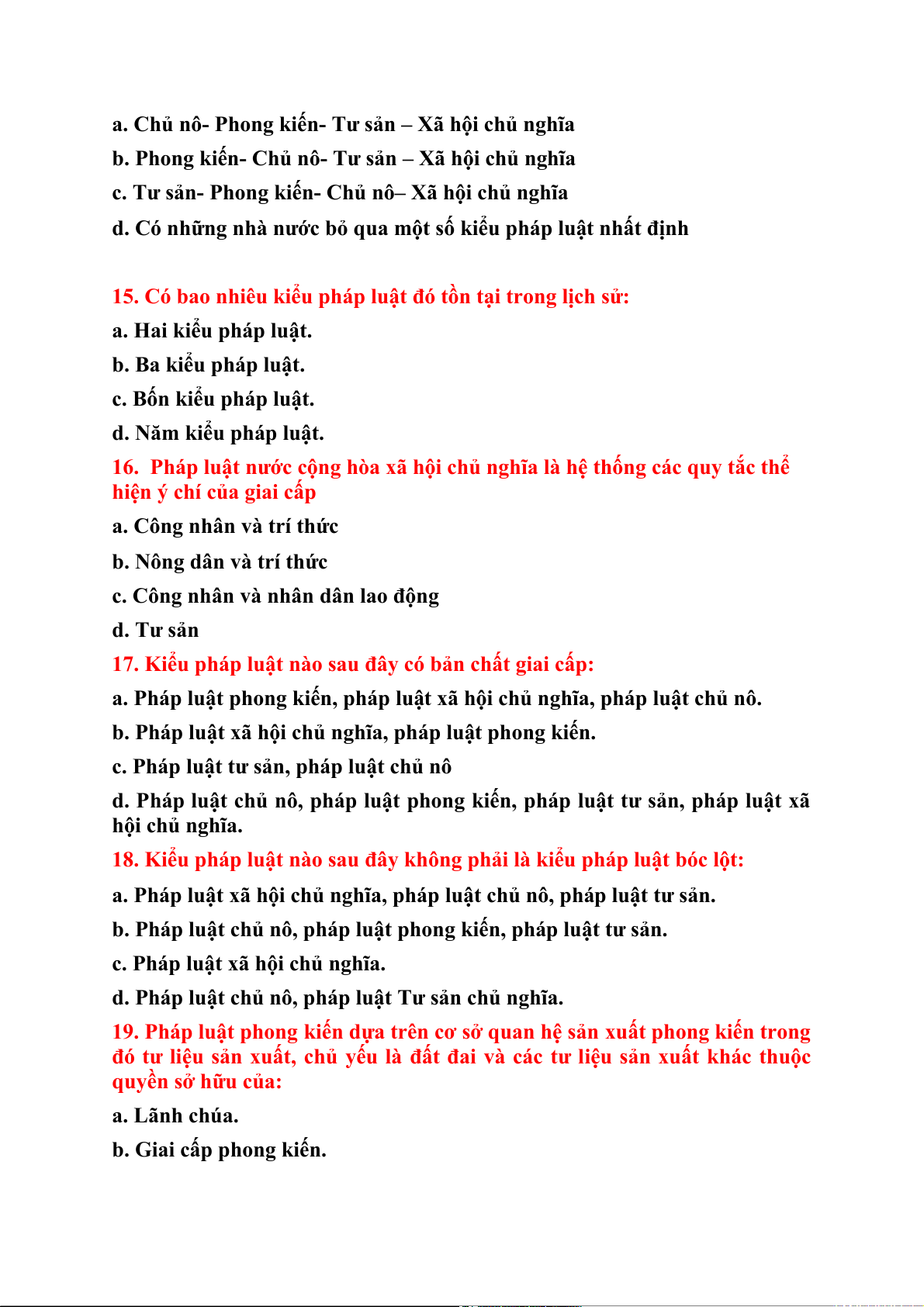 15. Có bao nhiêu kiểu pháp luật đó tồn tại trong lịch sử: a. Hai kiểu pháp luật. b. Ba kiểu pháp luật. c. Bốn kiểu pháp luật. d. Năm kiểu pháp luật.