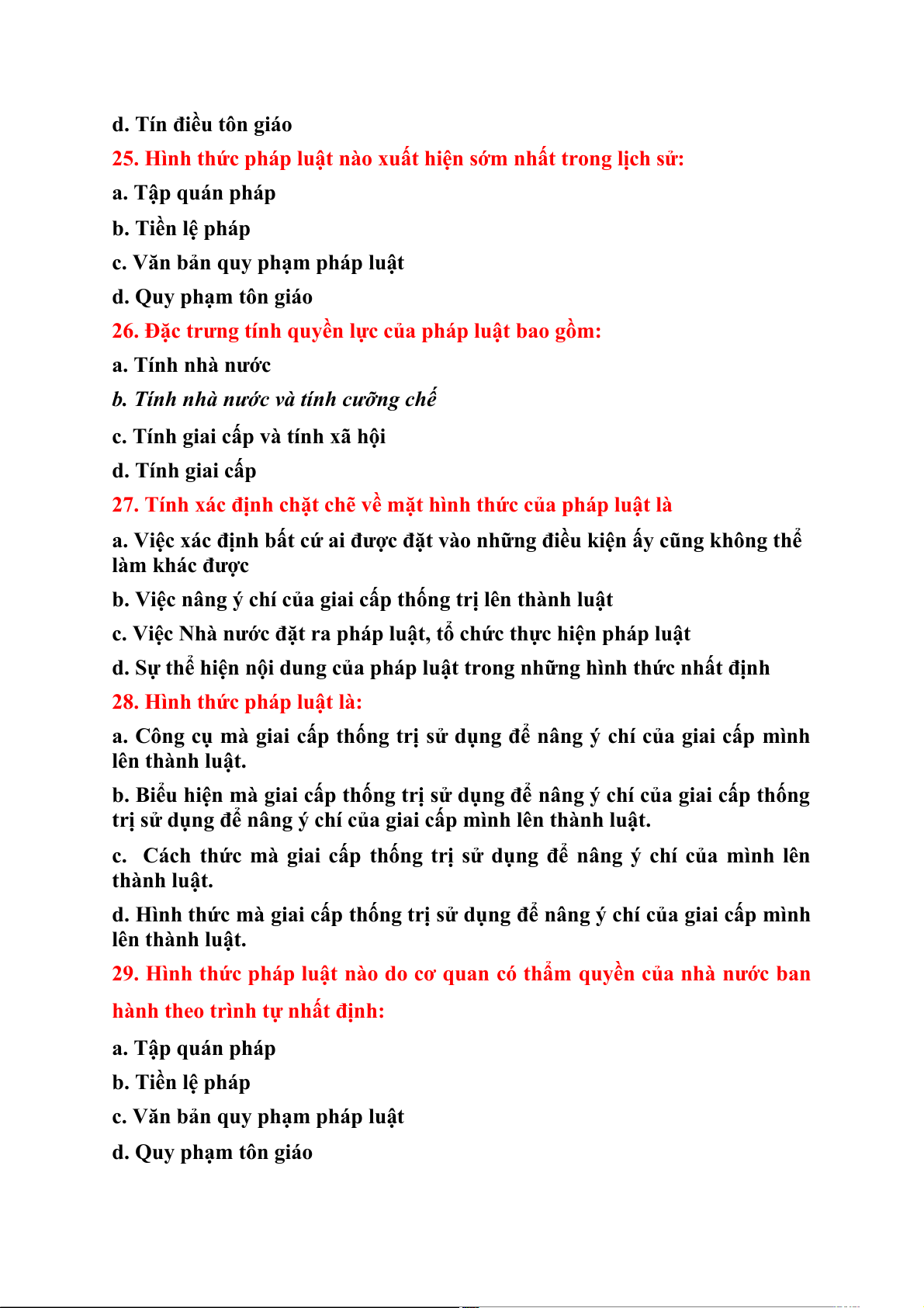 25. Hình thức pháp luật nào xuất hiện sớm nhất trong lịch sử: a. Tập quán pháp b. Tiền lệ pháp