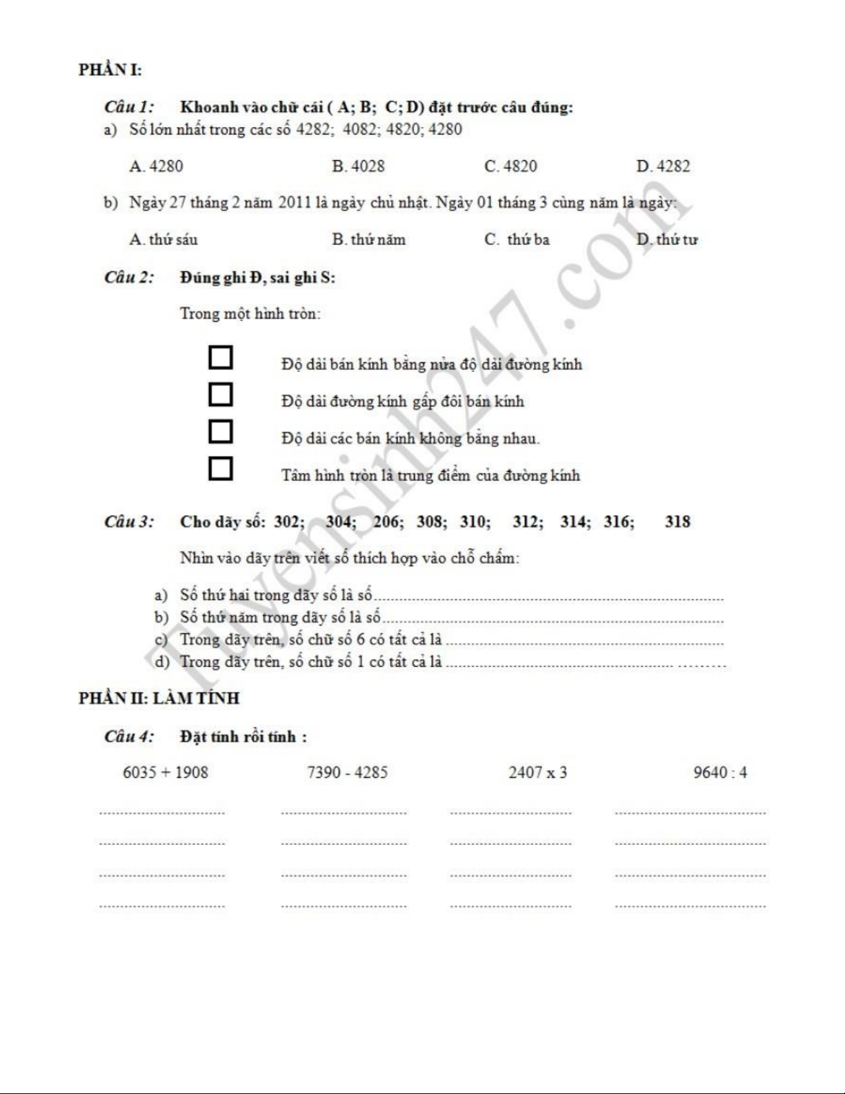 Câu 3. Trong cùng một năm, ngày 27 tháng 3 là thứ năm, ngày 30 tháng 3 là thứ mấy? A. Thứ ba B. Thứ năm