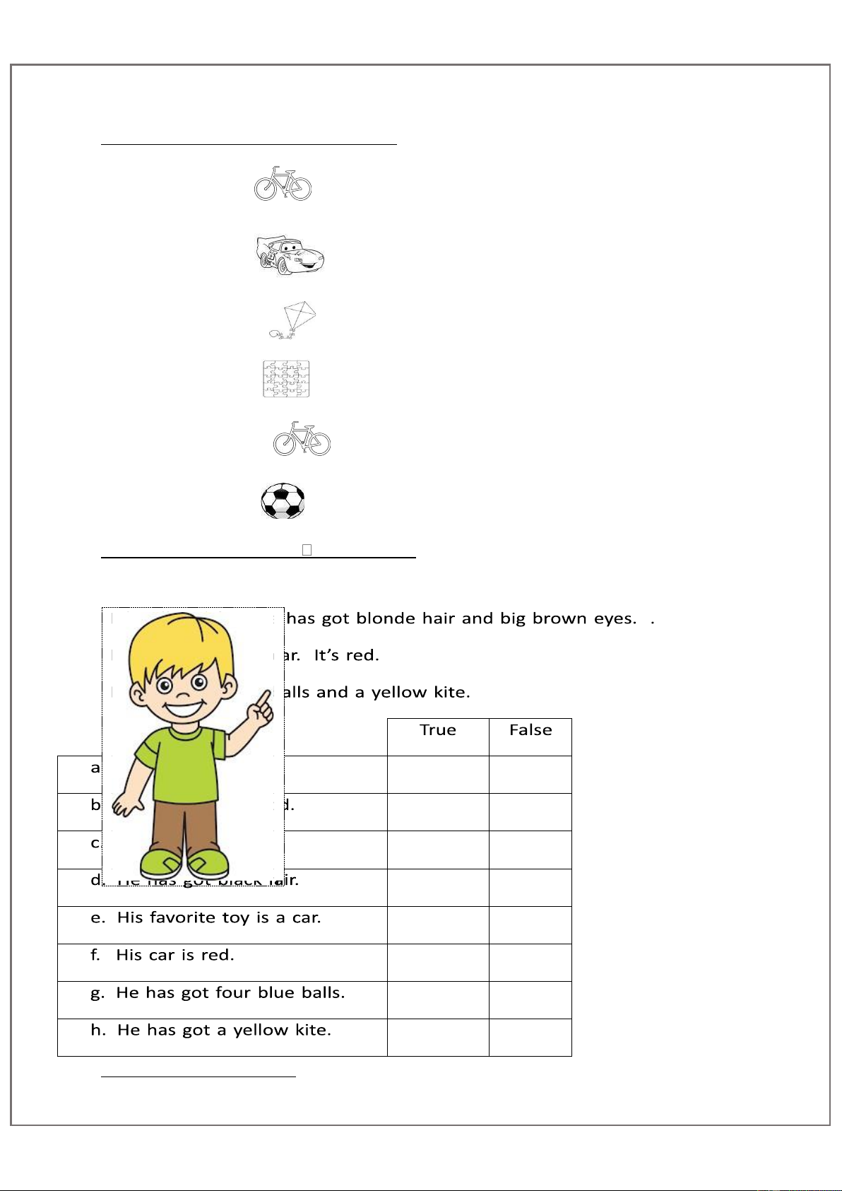 Exercise 6 : Read and tick ( ) True or False This is John. He’s eight years old. Exercise 7 : Read and match. pg. 4 lOMoAR cPSD| 44879730 Unit 2 Playtime ! 1. What is your name ? a. I’m seven years old. 1. 2 How old are you ? b. No ,it isn’t. 2. 3. What is this ? c. My name is Ben. 3. 4. Is this your kite ? d. It is a pen. 4. 5. What color do you like ?