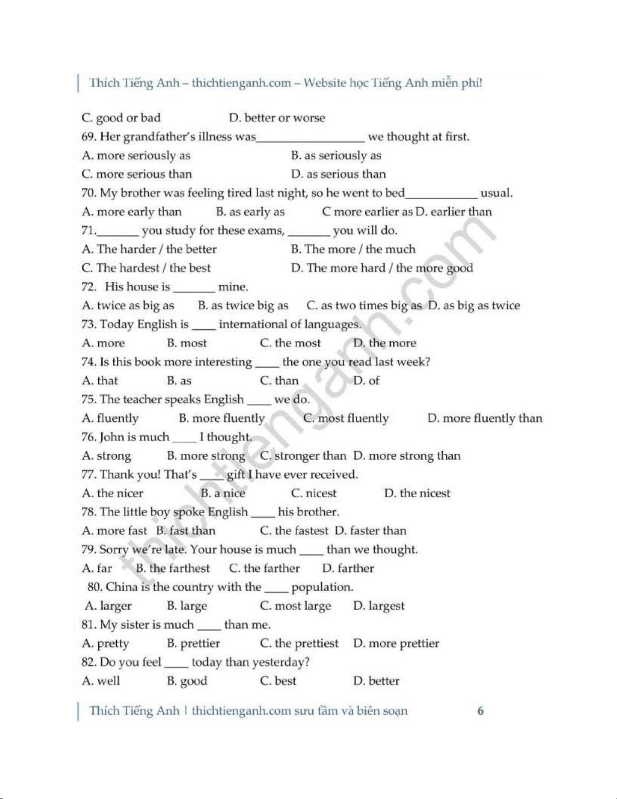 a. the poorest b. the poorer c. the more poor d. poorer 19. My father is as yours. a. old b. as old c. olderd. so old 20. HCM city is than Hanoi. a. large b. largest c. more large d. larger Exercise 2 1.