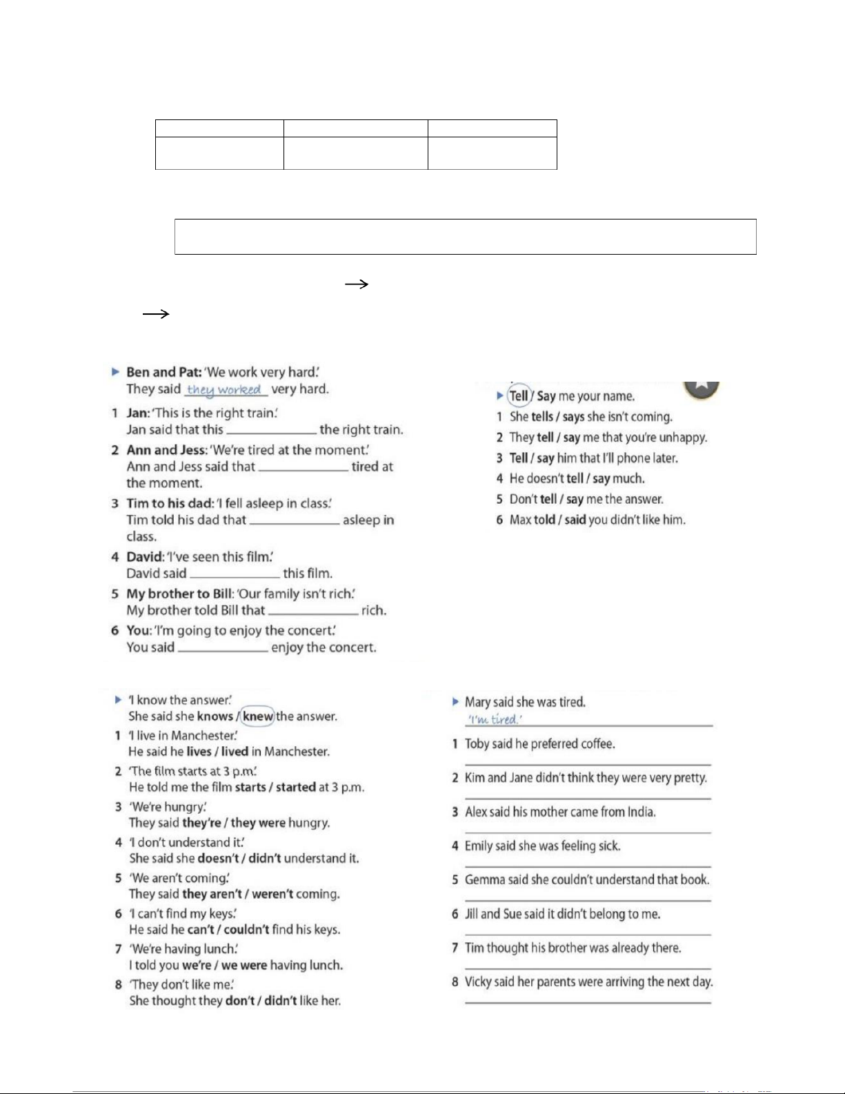Ex 2: Write the verbs in reported speech Ex 3: Say or tell. Circle the correct verb.