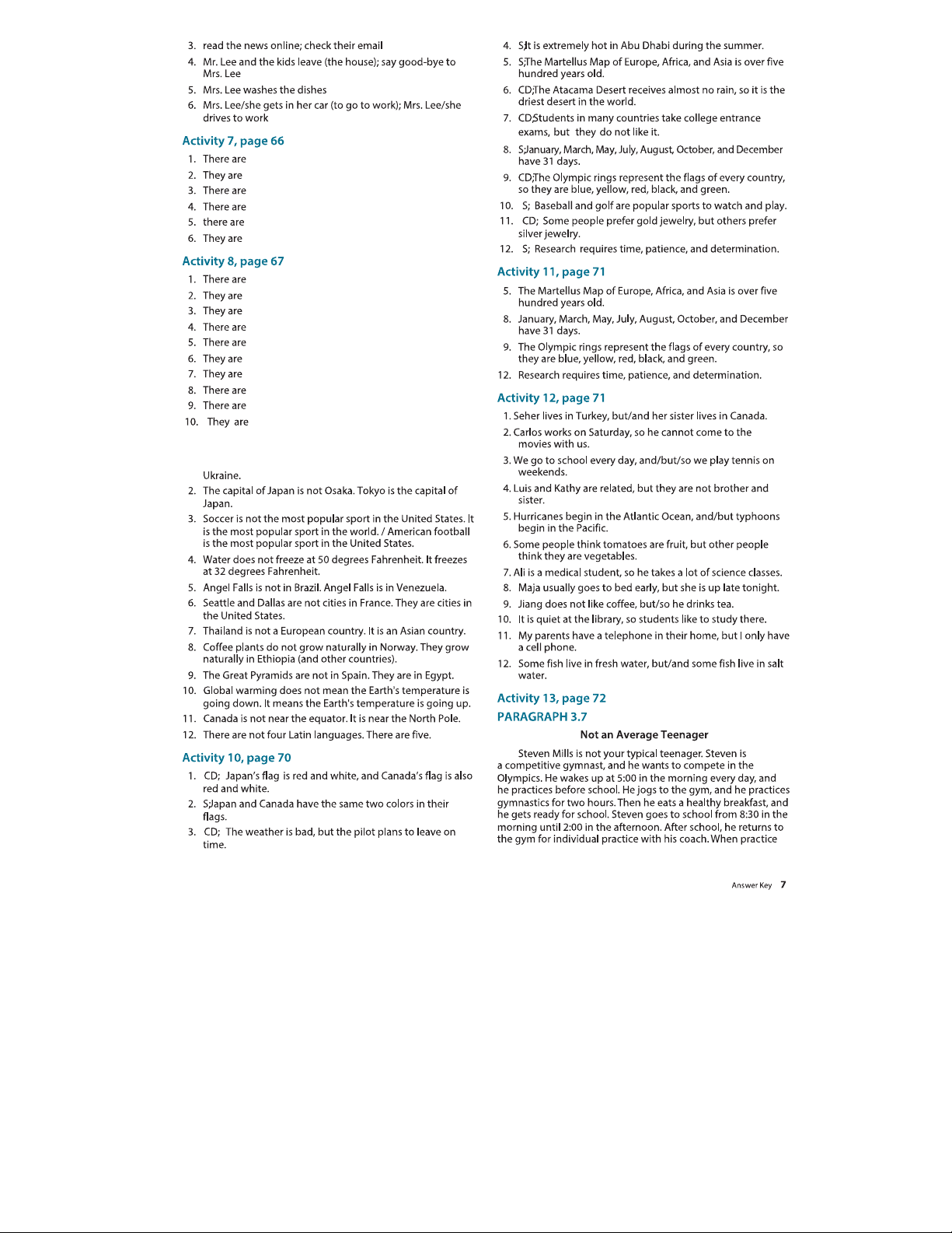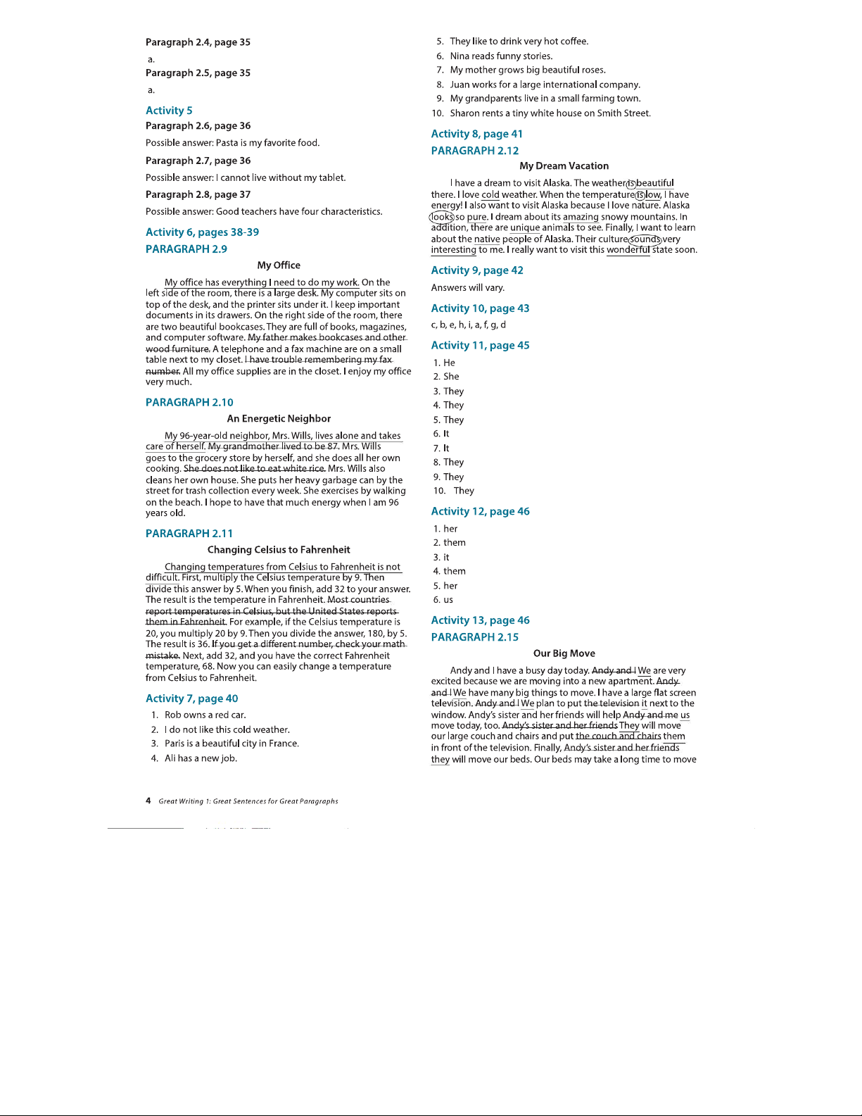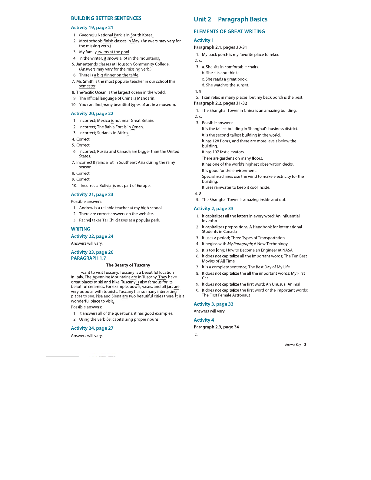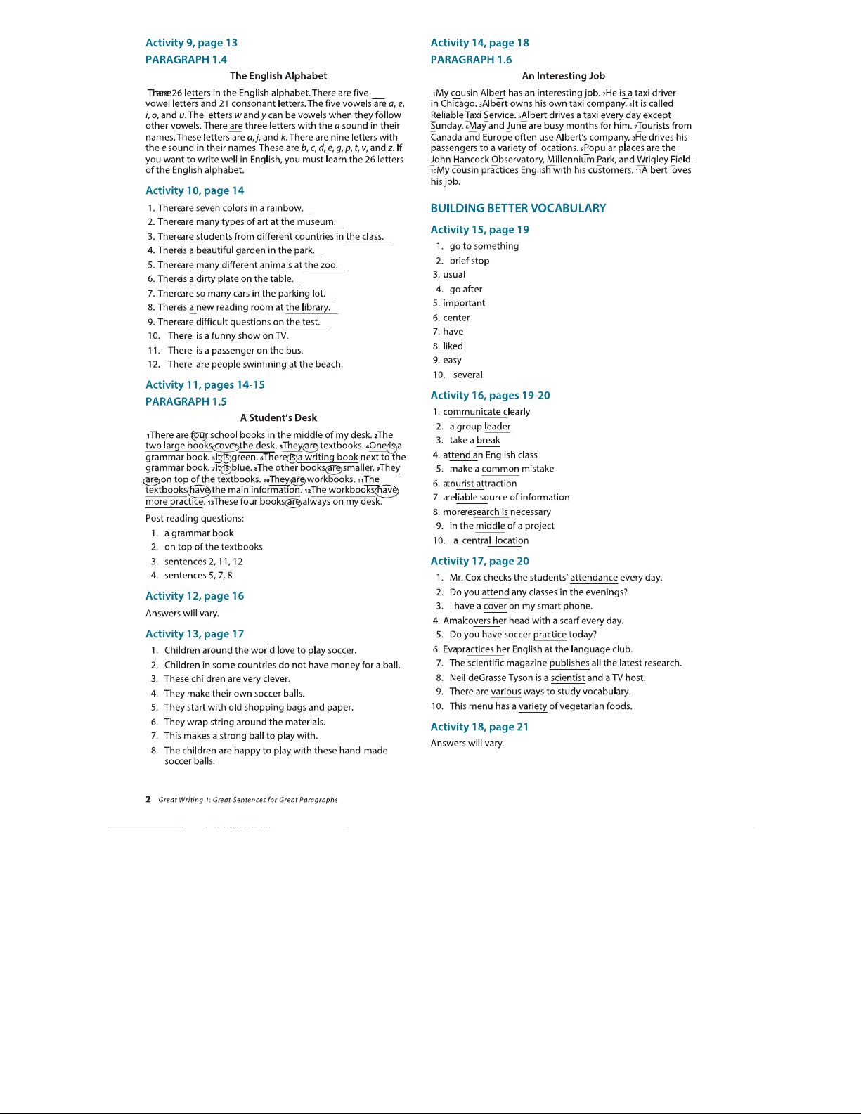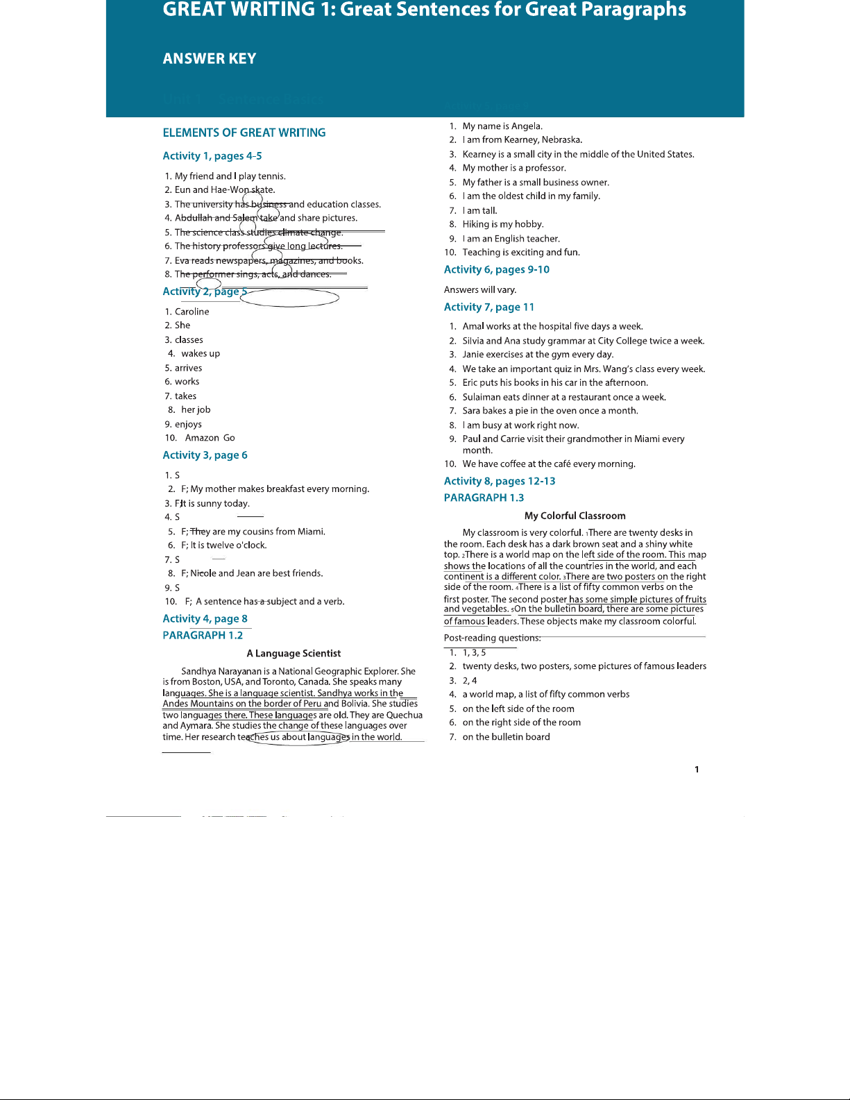 Great Writing 1 (5th Ed) Answer Key for Sentence Basics Activities