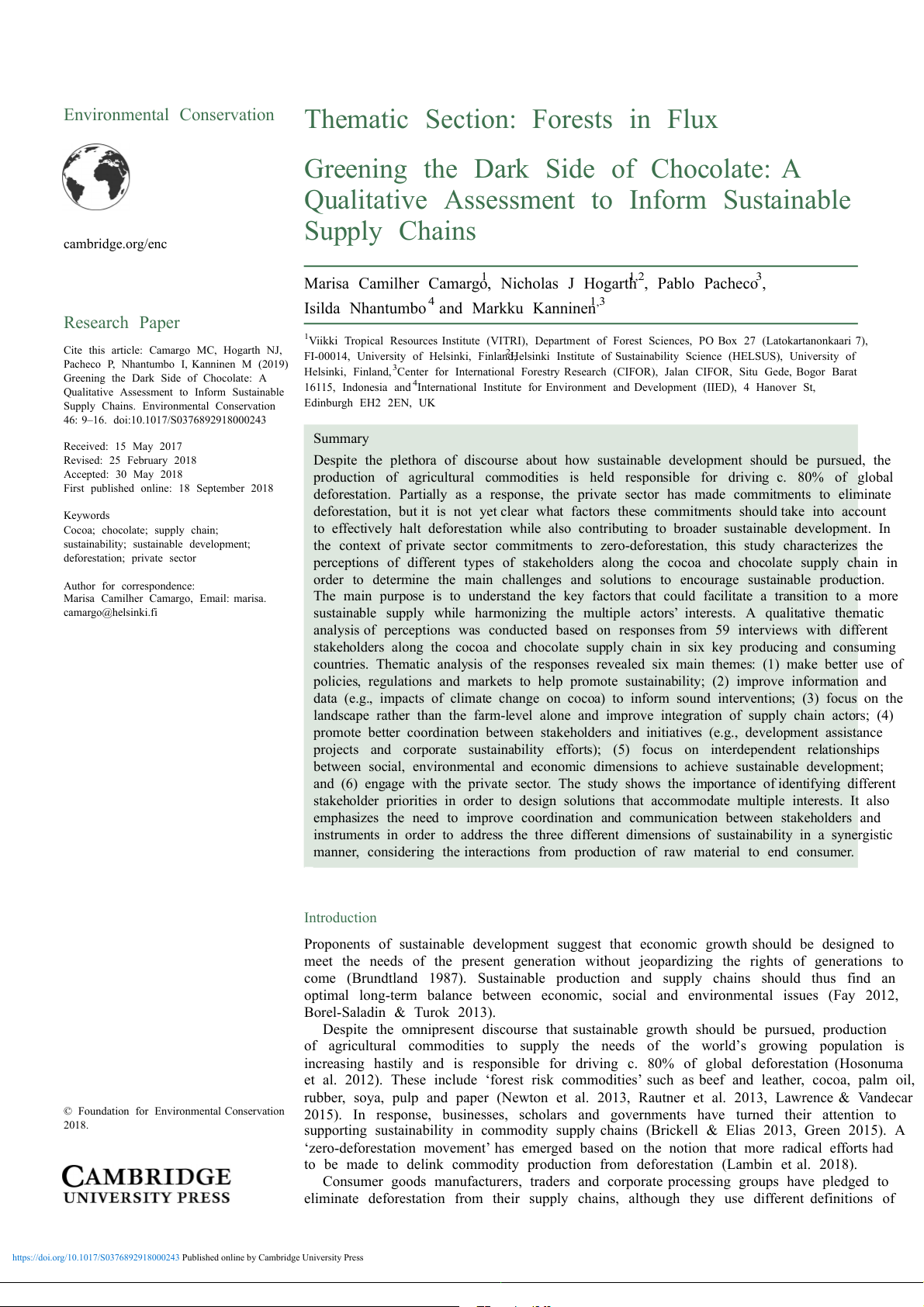 Camargo M, Nhamtumbo I (2016) Towards Sustainable Chocolate: Greening Drivers. Oxford, UK: Global Canopy Programme.
