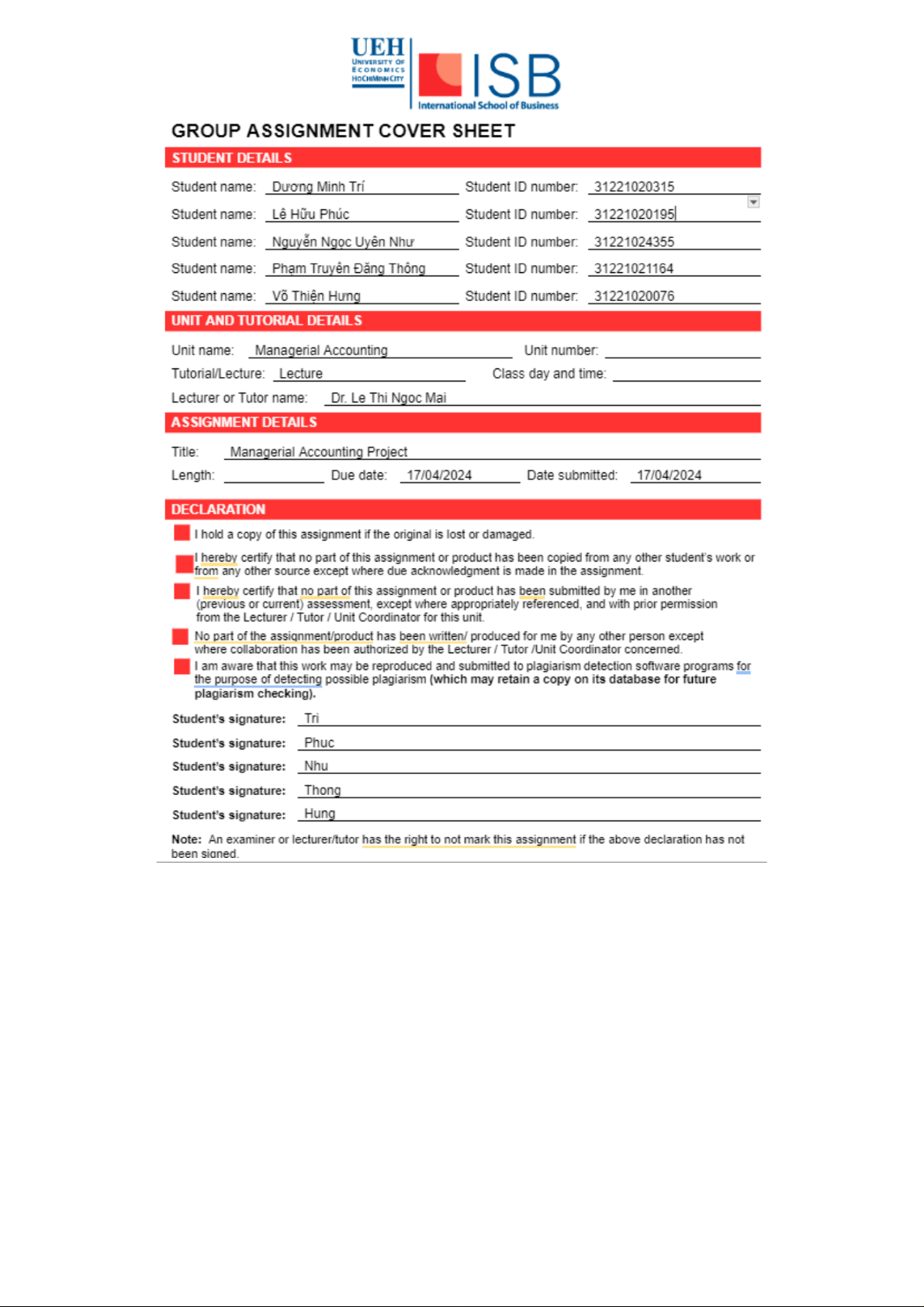 the cost of 20,000,000 VND for each month. Another factor for fixed manufacturing