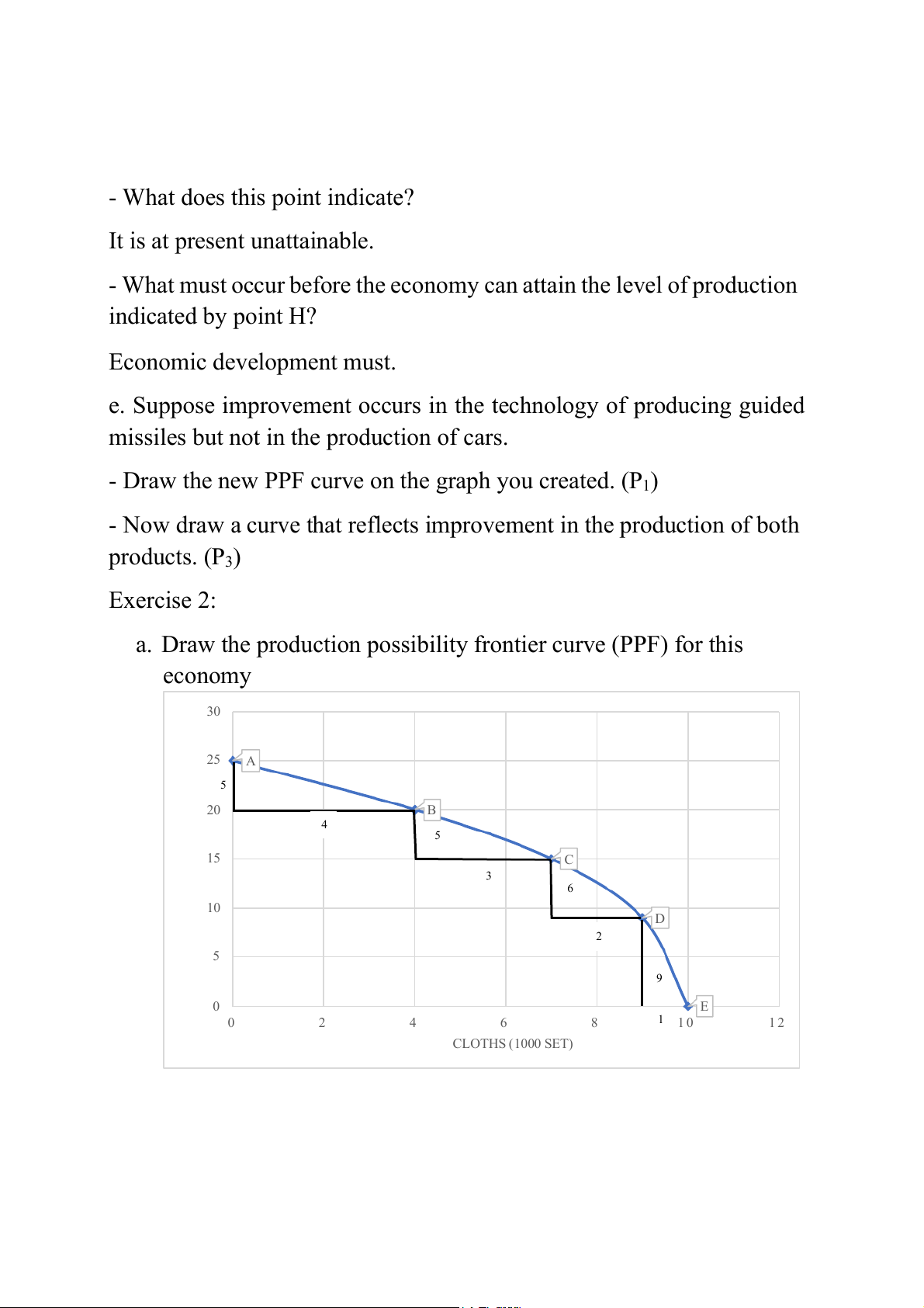 a. Draw the production possibility frontier curve (PPF) for this economy 30 25 A 5 S) 20 B N 4 O 5 (T T 15 C A E 3 H 6 W 10 D 2 5 9 0 E 0 2 4 6 8 1 1 0 1 2 CLOTHS (1000 SET)