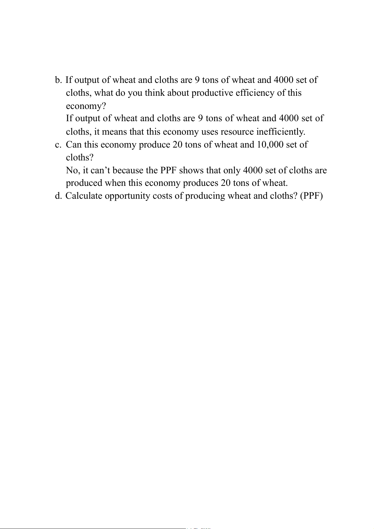 d. Calculate opportunity costs of producing wheat and cloths? (PPF)