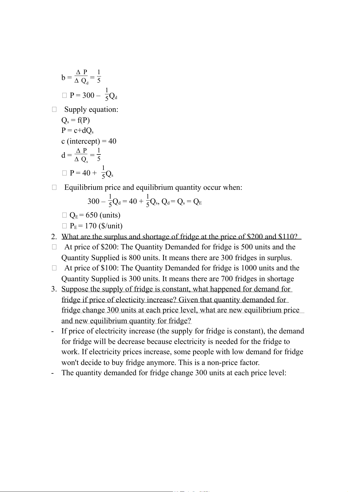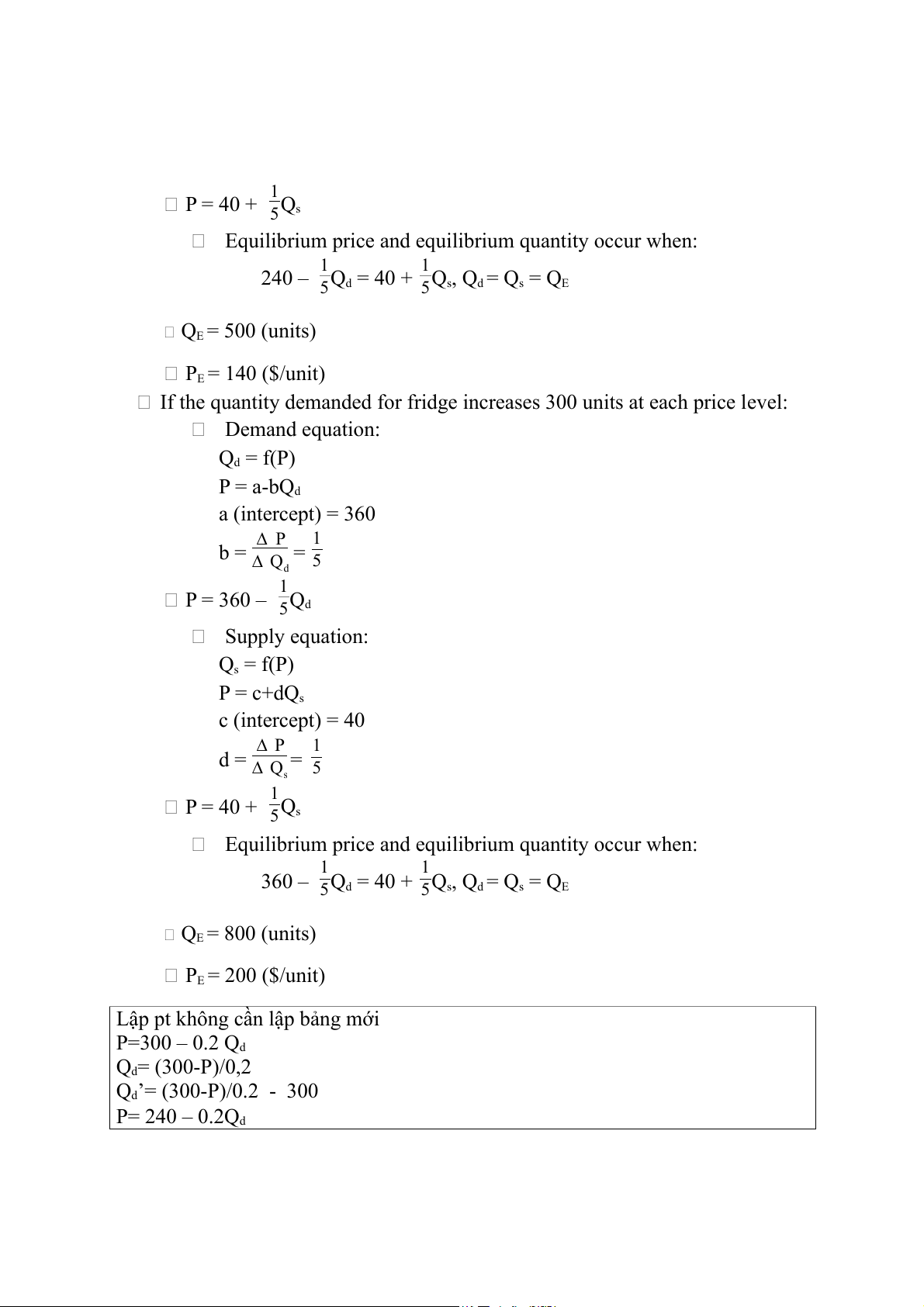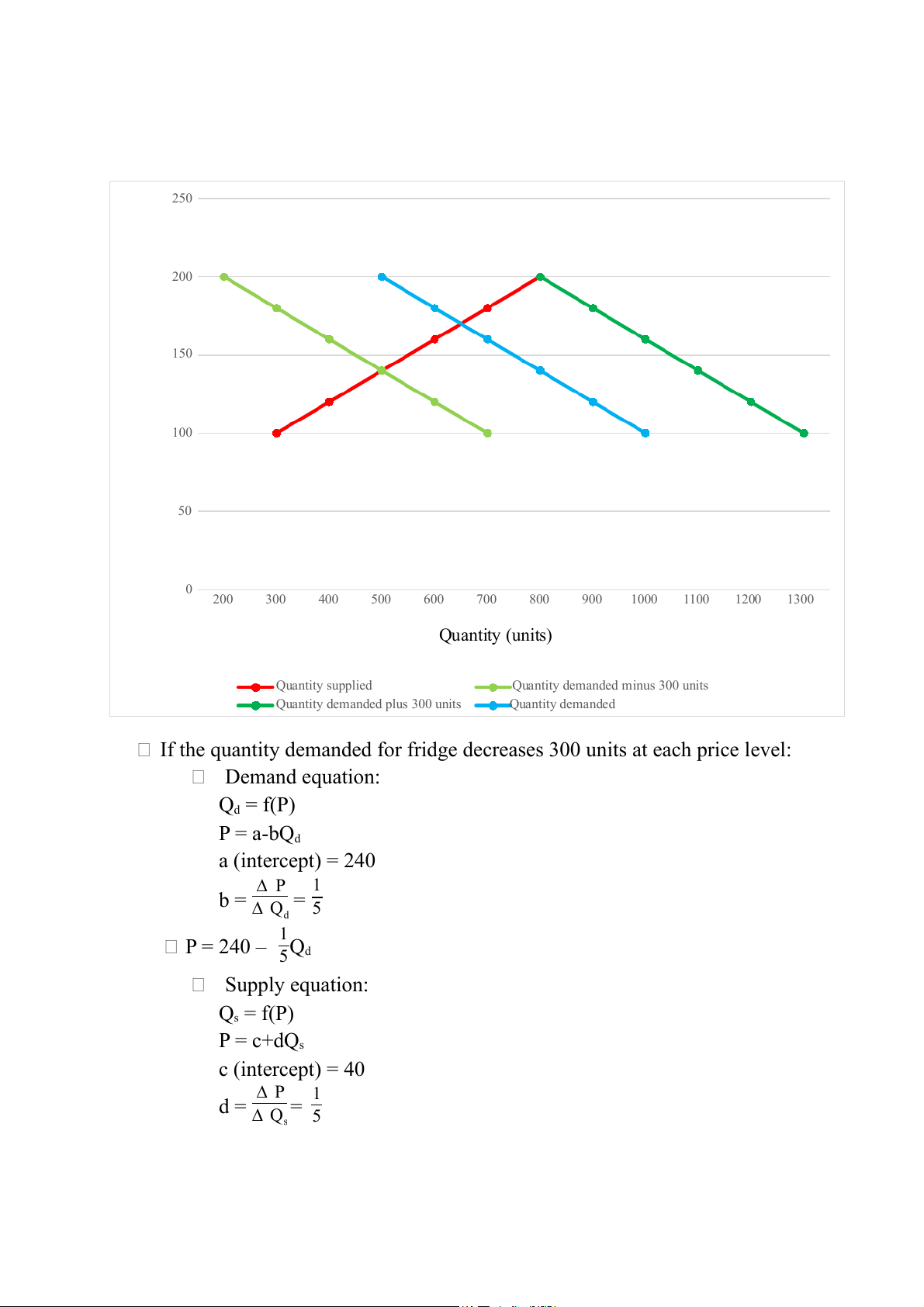 If the quantity demanded for fridge decreases 300 units at each price level: Demand equation: Qd = f(P) P = a-bQd a (intercept) = 240 ∆ P 1 b = ∆ Q = 5 d 1 P = 240 – 5Qd Supply equation: Qs = f(P) P = c+dQs c (intercept) = 40 ∆ P 1 d = ∆ Q = s 5 1 P = 40 + 5Qs