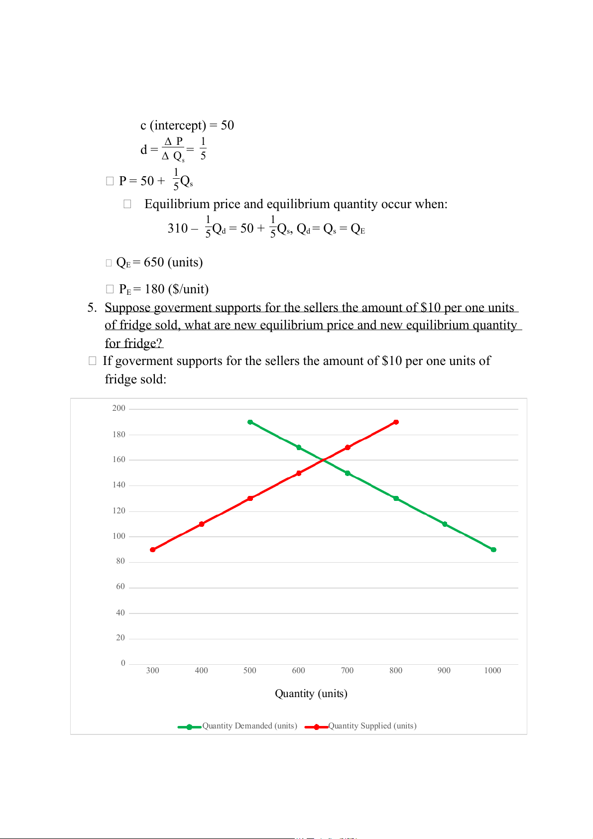 If goverment supports for the sellers the amount of $10 per one units of fridge sold: 200 180 160 140 120 t) ni /u 100 ($ 80 Price 60 40 20 0 300 400 500 600 700 800 900 1000 Quantity (units) Quantity Demanded (units) Quantity Supplied (units) Demand equation: Qd = f(P) P = a-bQd a (intercept) = 290 ∆ P 1 b = ∆ Q = d 5 1 P = 290 – 5Qd Supply equation: Qs = f(P) P = c+dQs c (intercept) = 30 ∆ P 1 d = ∆ Q = 5 s 1 P = 30 + 5Qs