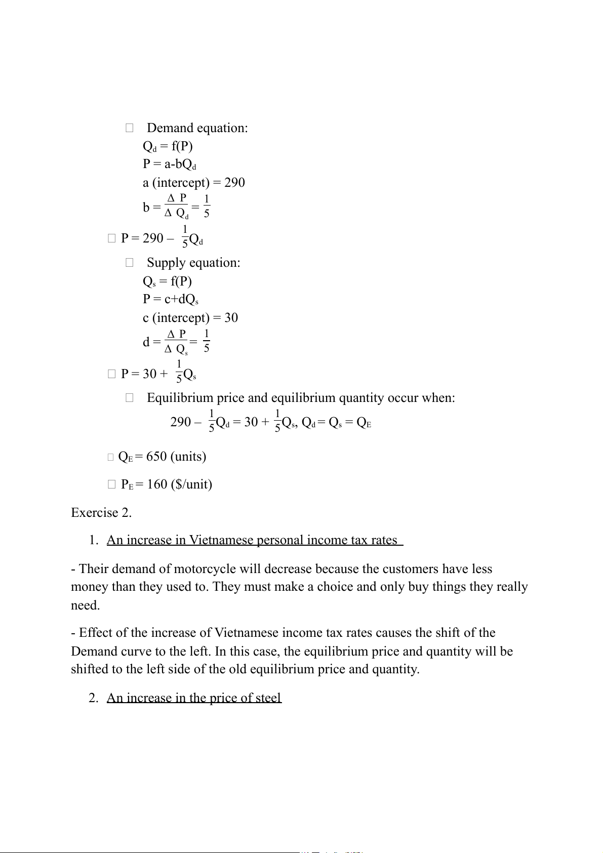 290 – 5Qd = 30 + 5Qs, Qd = Qs = QE QE = 650 (units) PE = 160 ($/unit) Exercise 2. 1. An increase in