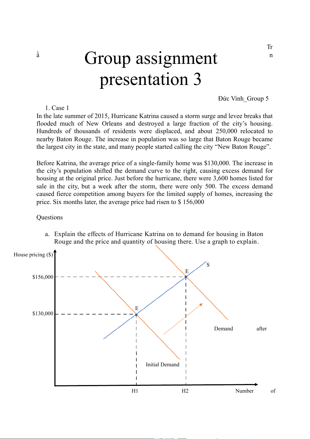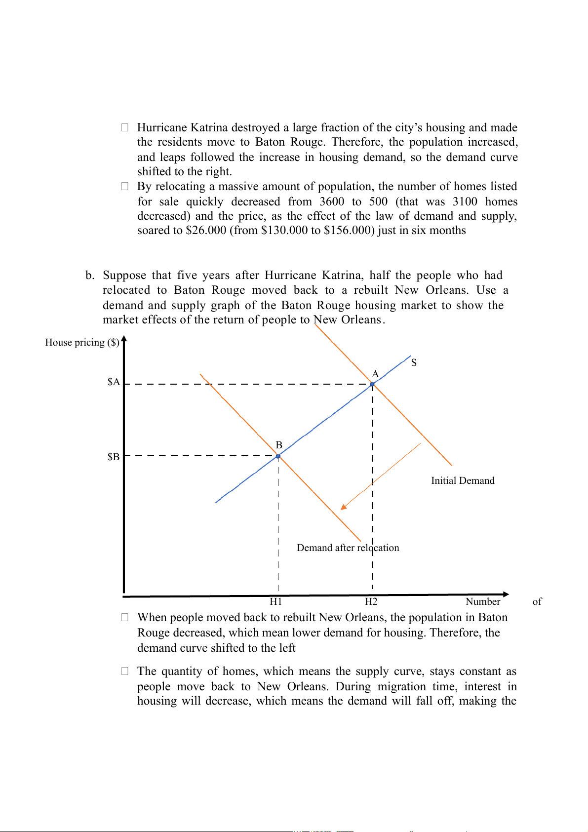 market effects of the return of people to New Orleans. House pricing ($) S A $A B $B Initial Demand Demand after relocation H1 H2 Number of